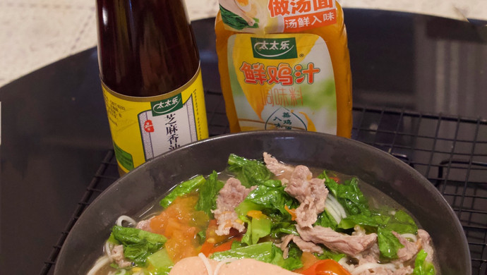汤鲜入味。材料准备:主料:牛肉20克、盐适量辅料:油菜适量、食用油适量、太太乐鸡精半勺、面条适量、太太乐香油少量、午餐肉2片、番茄1个制作步骤:步骤1、牛肉切片,午餐肉切片,备...