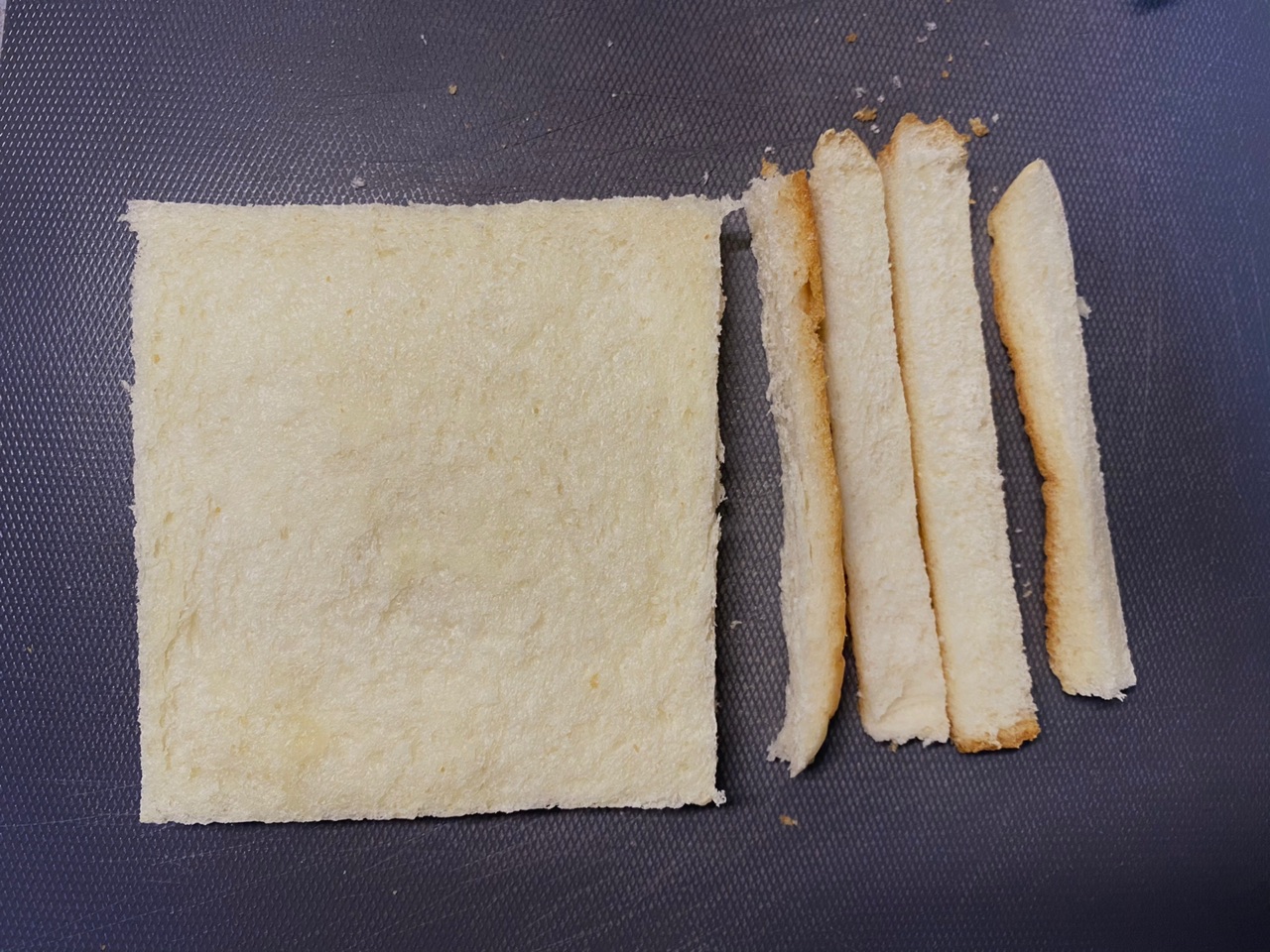 步骤2、在白吐司上涂上花生酱,接着拿一片白吐司重合粘上压实后按个人喜好大小切块