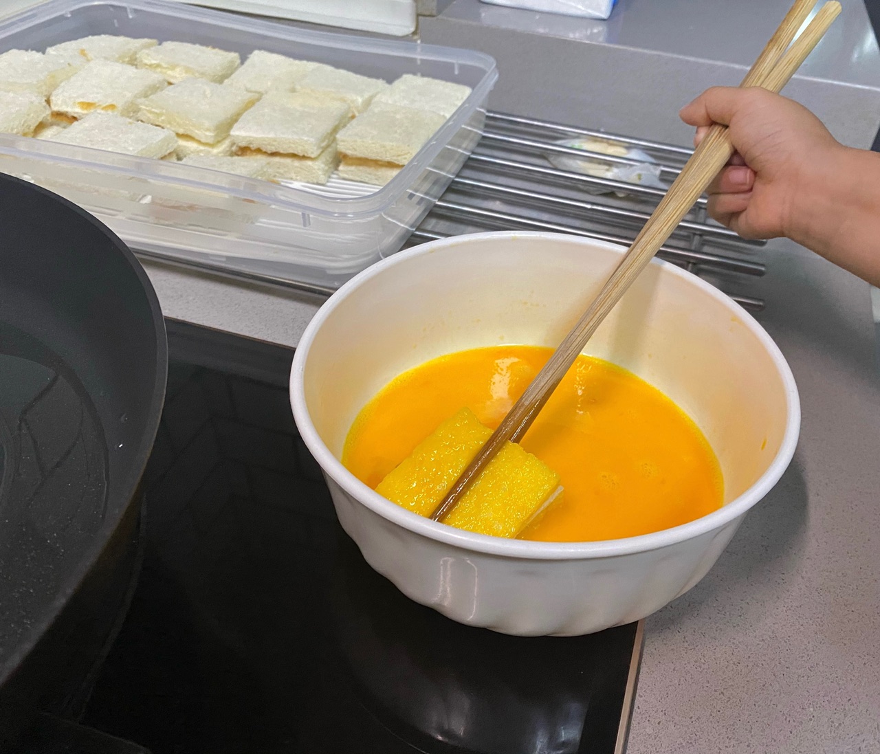 步骤4、平底锅中倒入少许油开火预热,切好的吐司块放入鸡蛋液中,让鸡蛋液充分包裹住