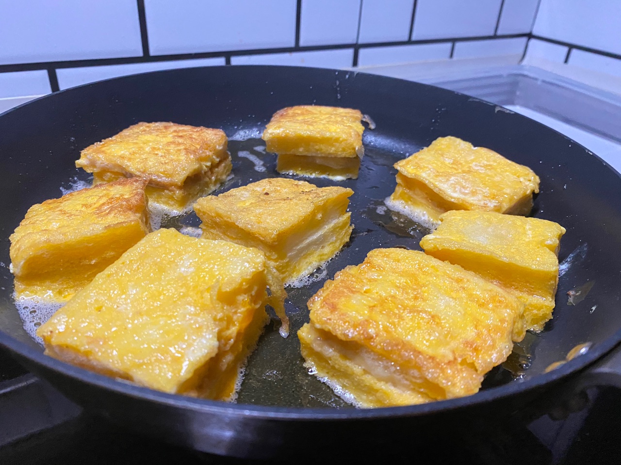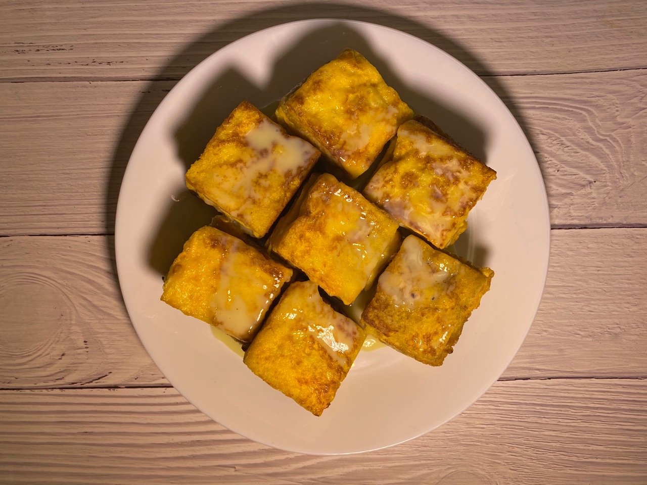 步骤6、将吐司块煎至两面金黄,淋上少许炼乳即可