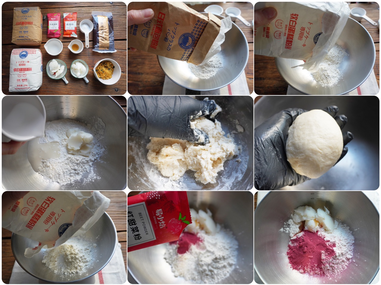 步骤1、1.低筋粉和高筋粉混合,加入糖粉、猪油、水,混合揉匀成水油皮面团,盖保鲜膜备用。低筋面粉和红甜菜粉、柠檬汁、猪油混合。