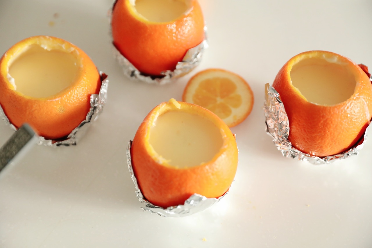 步骤9、再倒入橙子慕斯液体至橙子1/2处。送入冷冻半小时让其凝固。