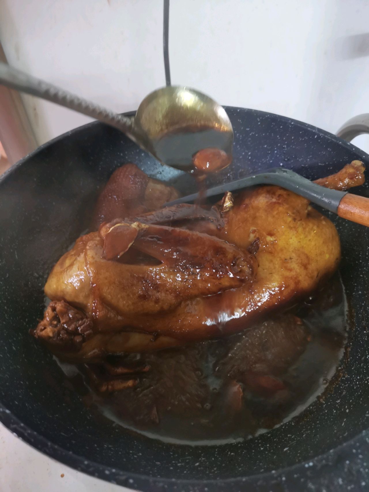 步骤4、边煮炒边用汤汁浇在鸭子身上,煮20分钟