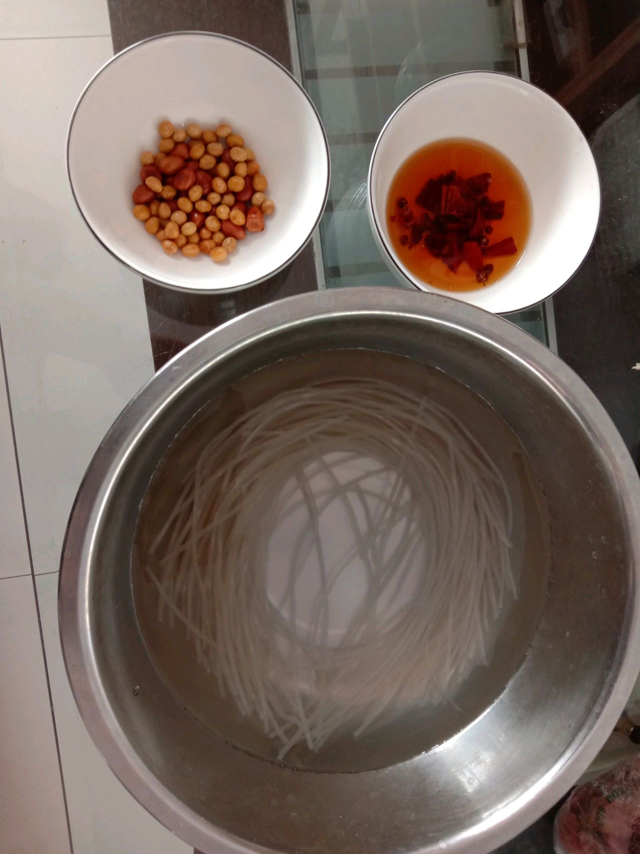 步骤1、红薯粉提前1小时泡发,用50到60度的温水;花生,黄豆提前炸好;油辣子提前泼好。