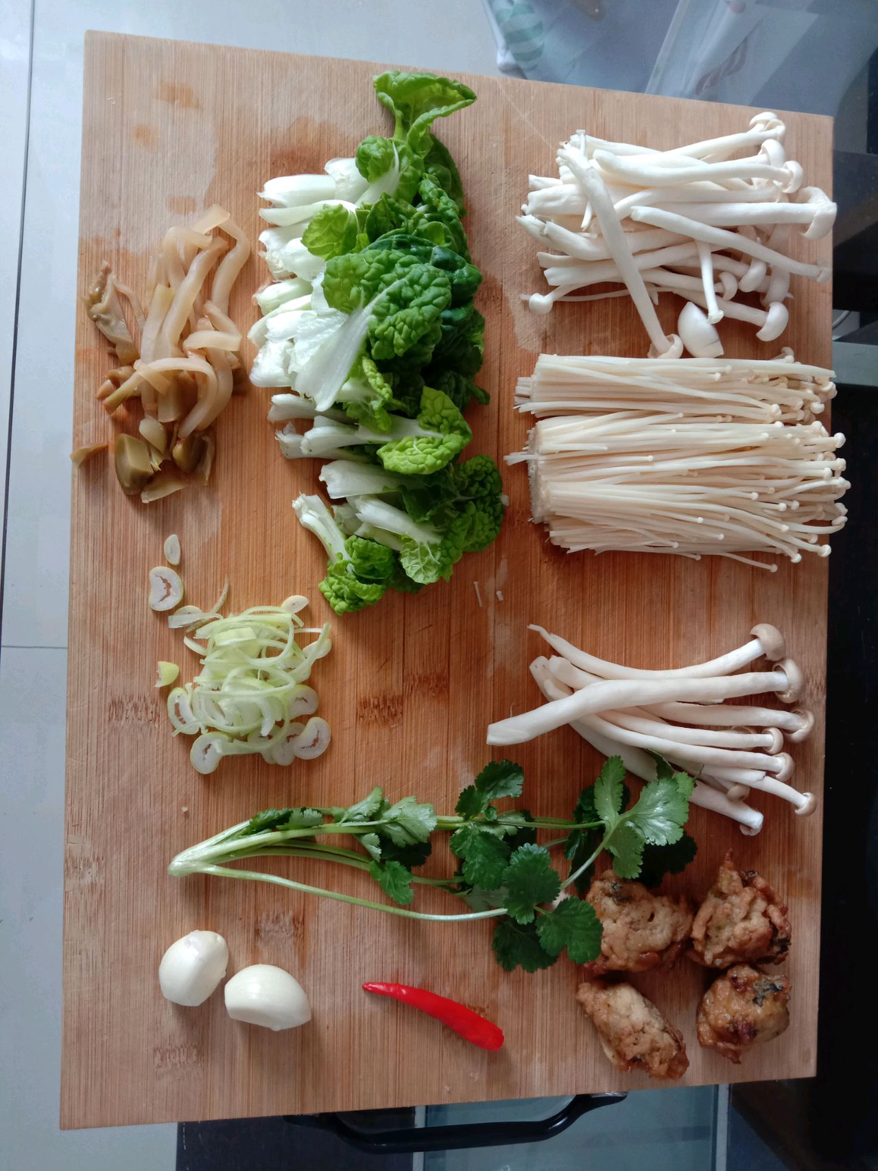 步骤2、白玉菇,蟹味菇,金针菇去除根部;黄心菜,香菜,小米椒,香葱,大蒜和上面的三菇均清洗干净备用。萝卜丸子放不放都行,但榨菜爽口必须放。