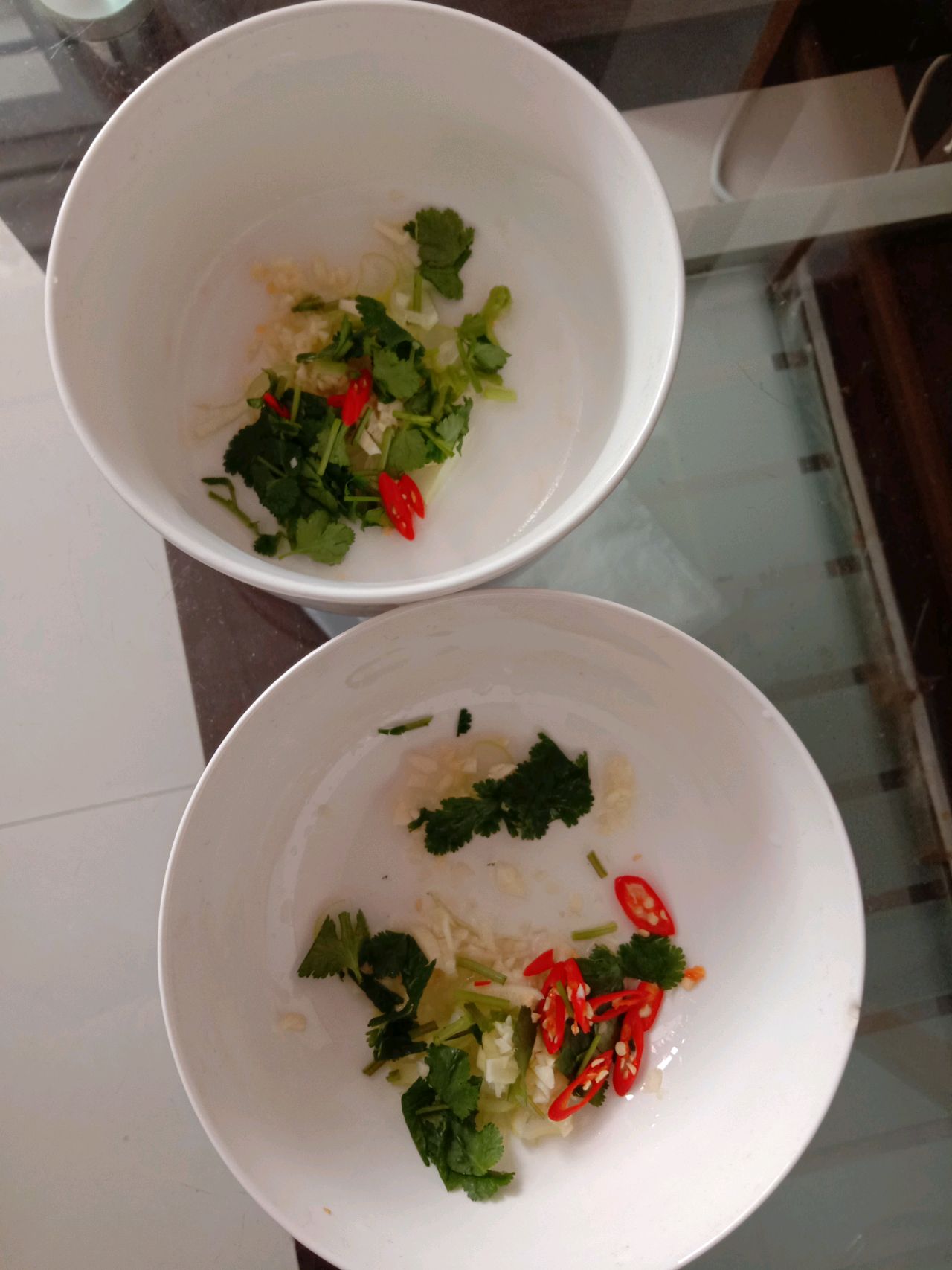步骤3、架锅放两碗水烧开,同时大蒜切末,香菜香葱切小段,小米椒切圈放碗中。