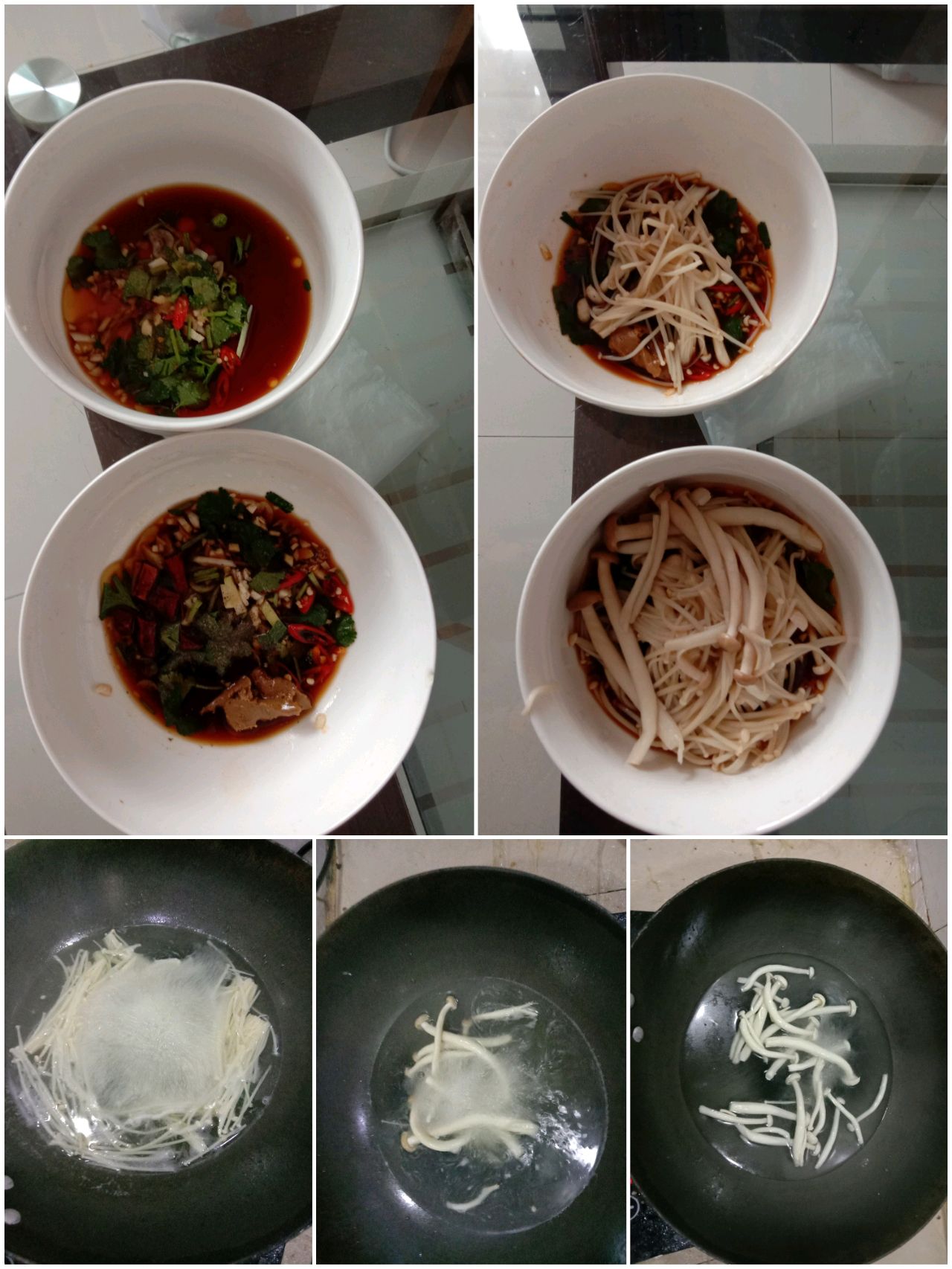 步骤4、水烧开后,依次放入白玉菇,金针菇,蟹味菇各焯水1分钟捞出。同时在碗中按量(上面原料的量均是一份的量)加入盐,糖,胡椒粉,米醋,陈醋,生抽,香油,辣子油。