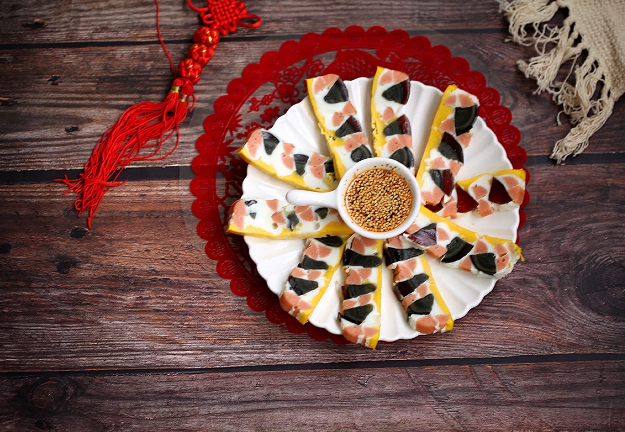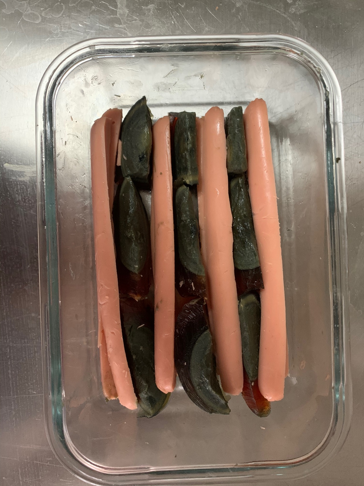 步骤5、火腿肠和皮蛋依次交替摆放。火腿肠小,比皮蛋矮,于是我又切了一根摞上,高度持平了。
