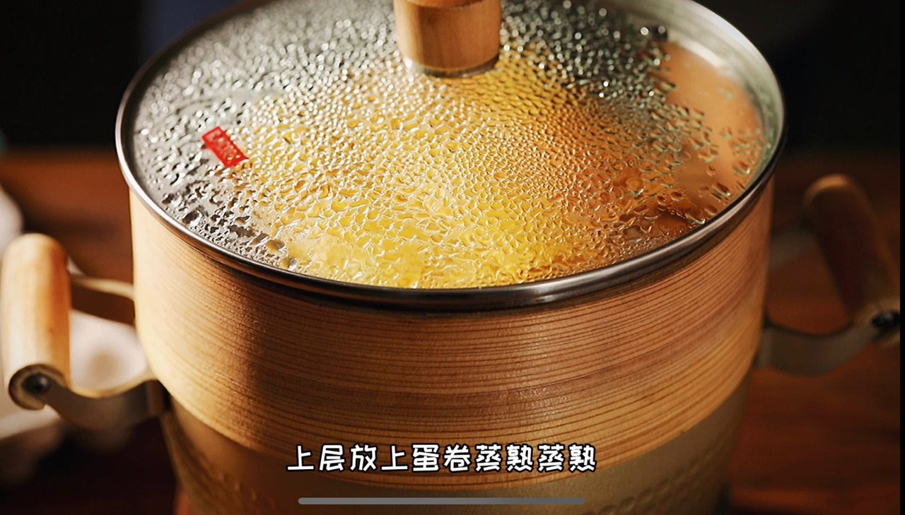 步骤3、做虾肉蛋卷虾肉馅,蒸肉蛋卷(虾肉糜300g、鸡蛋4个、小葱少许、料酒8ml、胡椒粉2g、香油少许、糖盐适量)
