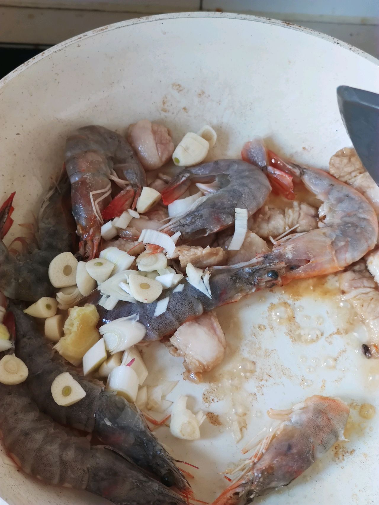 步骤3、放上虾和葱姜蒜。翻炒