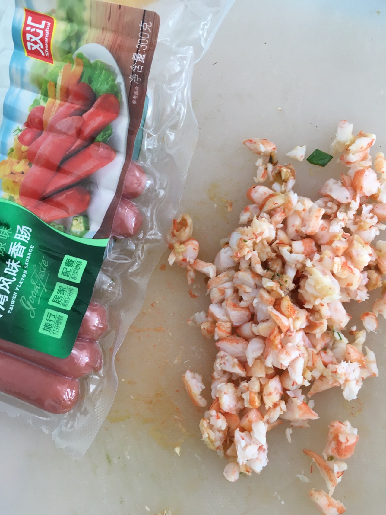 步骤3、把虾仁炒熟切碎备用火腿切碎备用