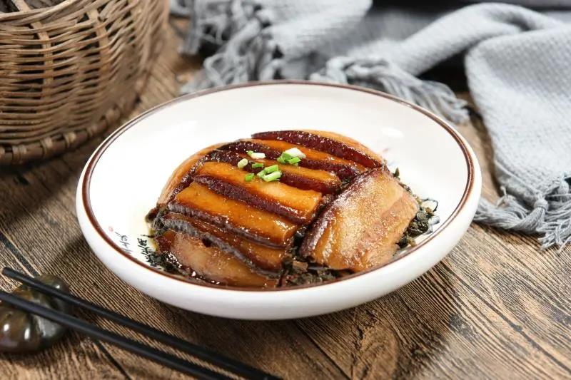 步骤7、蒸好的扣肉端出蒸锅,把盛装扣肉的碟子扣于碗上,翻过来,去掉扣碗,淋芡汁即可上桌食用了。