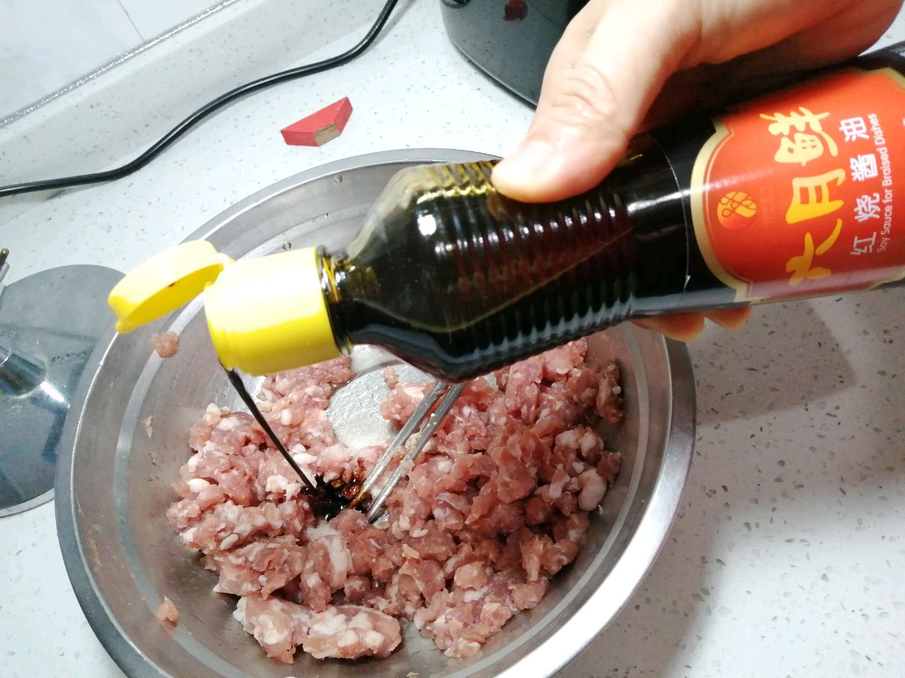 步骤9、放入炸好的肉丸,加入红烧酱油10g,加入开水没过肉丸一半
