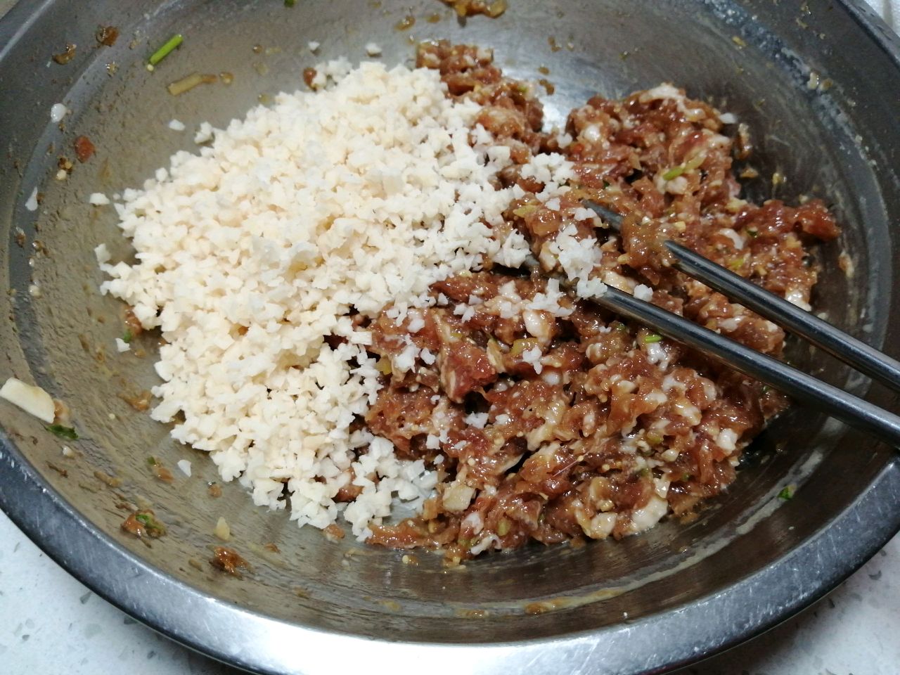 步骤2、加入葱花、姜末、盐、料酒搅匀,在打入一个鸡蛋搅匀