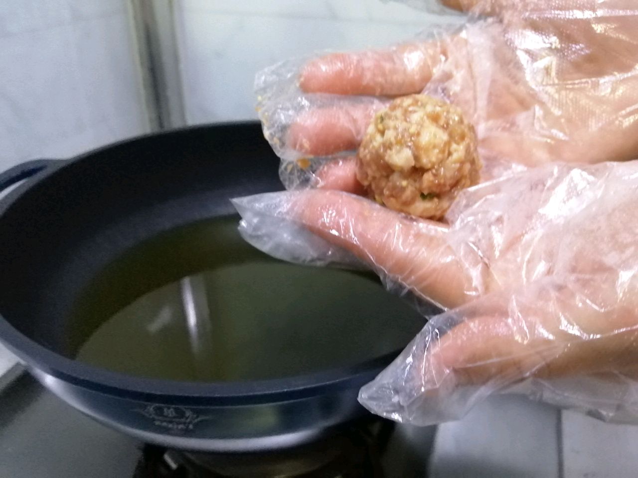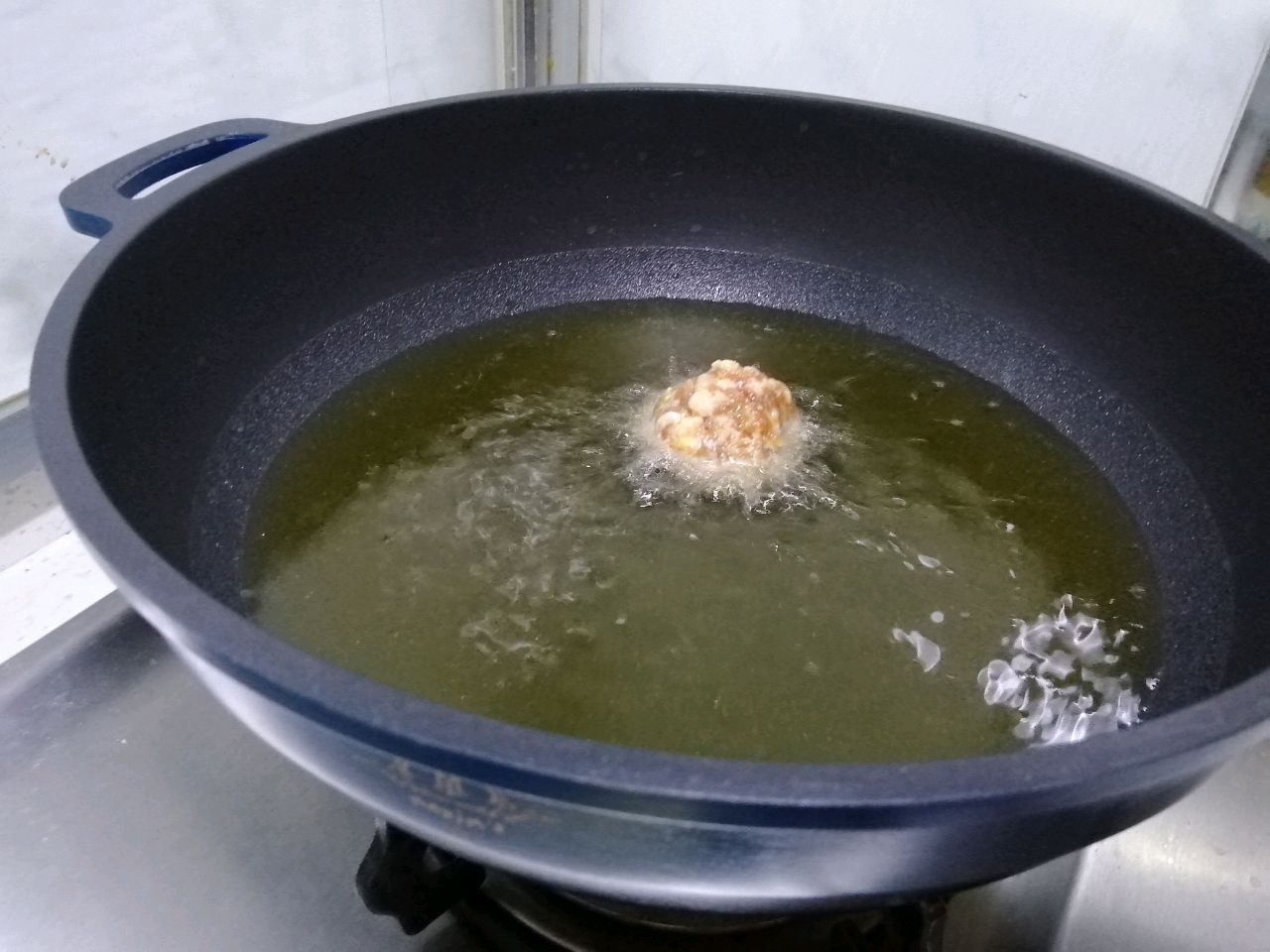 步骤6、炸至肉丸一面金黄翻面,一共炸大约5分钟,定型就可以