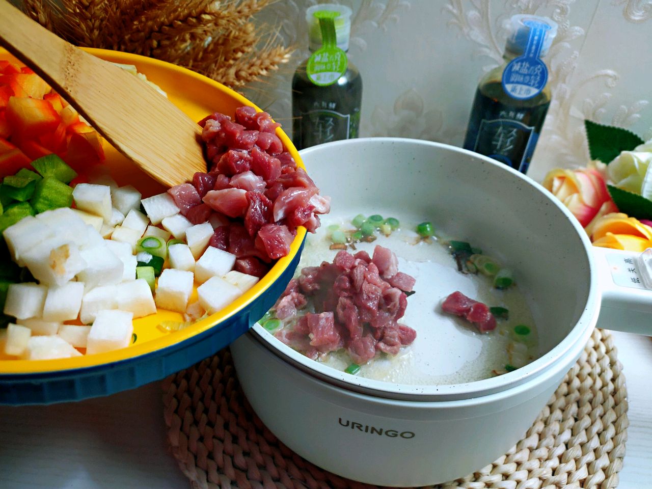 步骤2、把胡萝卜、白萝卜、绿萝卜、牛肉、葱、蒜切丁