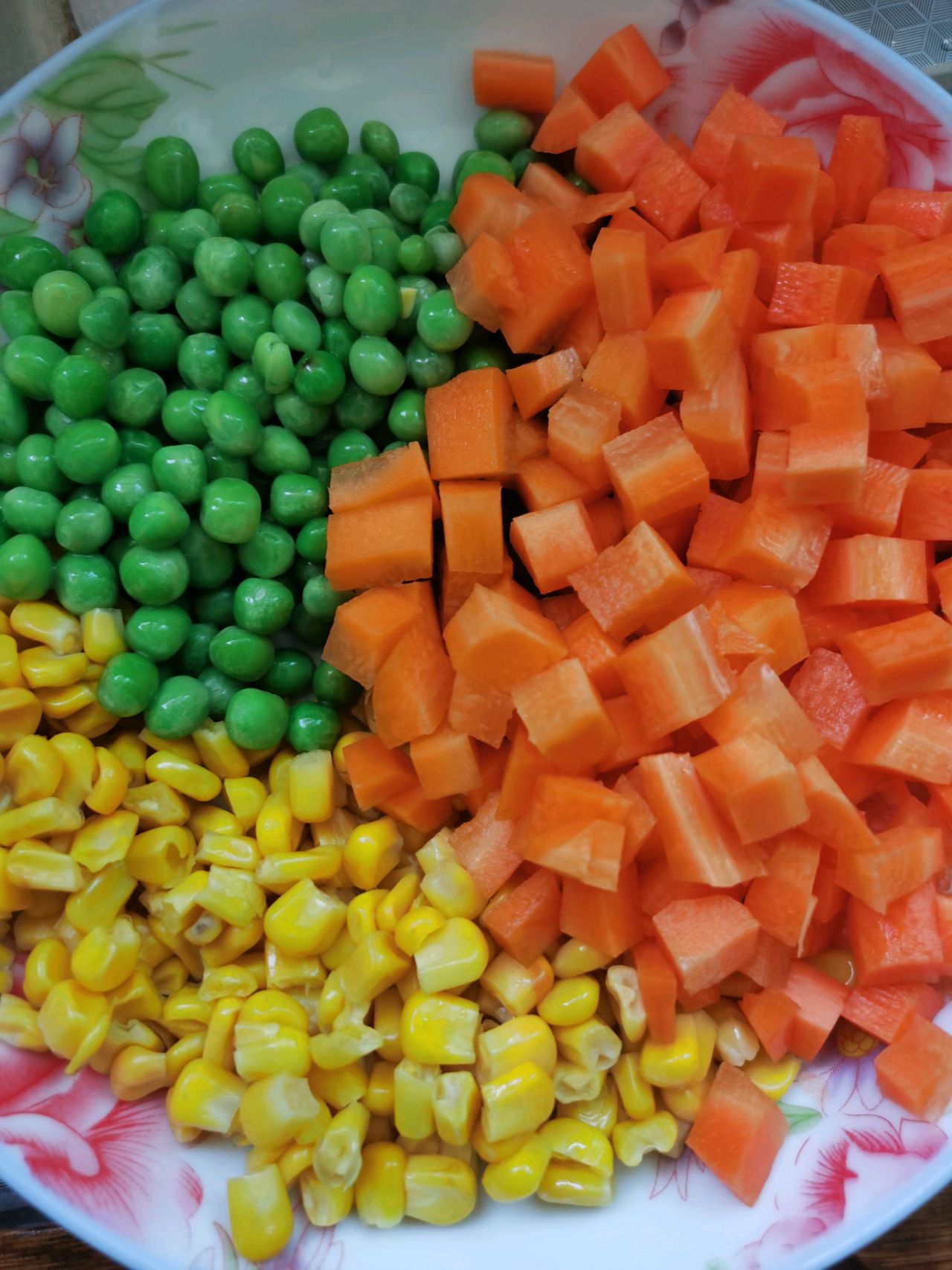 步骤2、准备豌豆粒,玉米粒,胡萝卜切丁