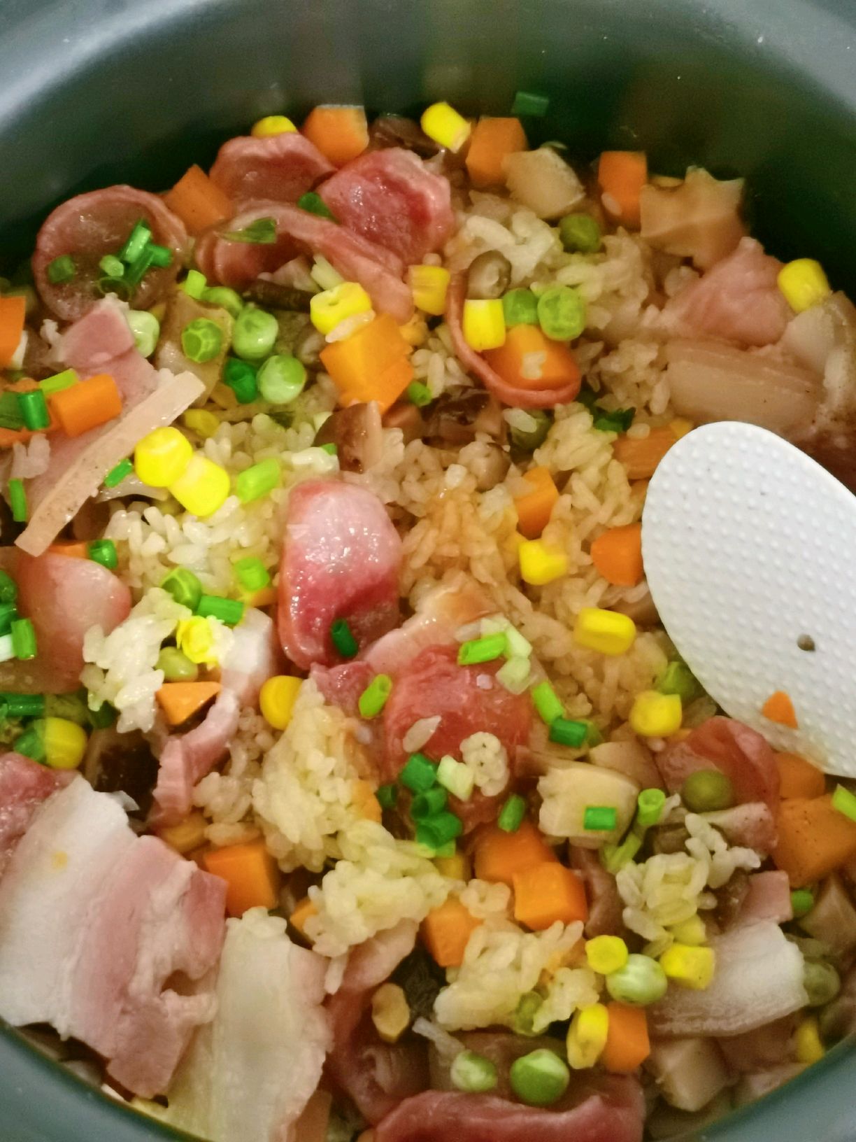 辅料:豌豆粒1把、玉米粒1把、胡萝卜半根、香肠1根、咸肉300克、葱适量、蚝油1勺、生抽1勺、胡椒粉少许、盐少许、香油1勺