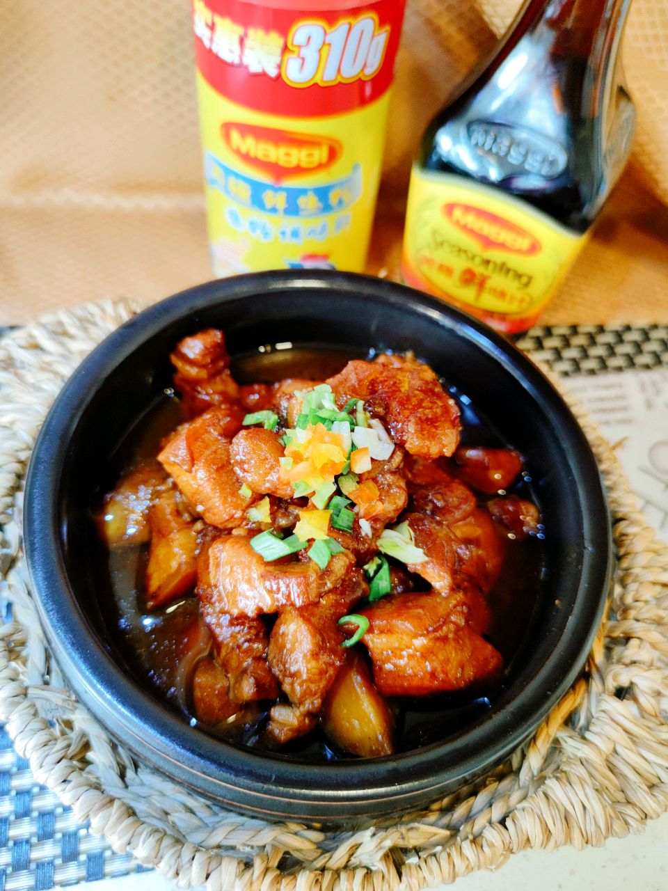 辅料:美极鲜鸡粉1、美极鲜味汁3勺、红烧酱油4勺、八角2个、白糖1勺、红醋1勺