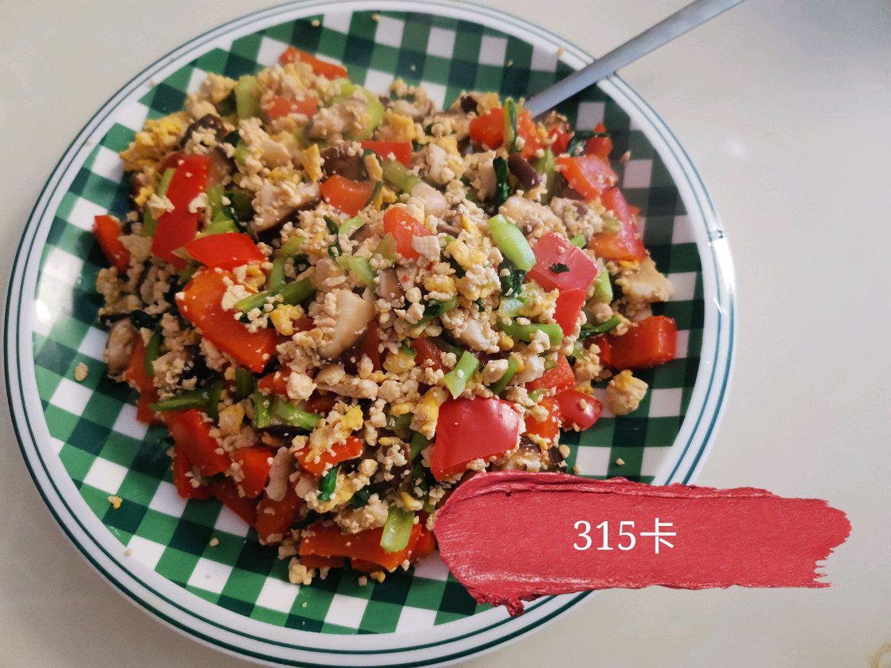 减肥时期不适合吃大量白米饭,这个炒豆腐热量只有315卡,也蛮好吃的,蛋白质(鸡蛋、豆腐)➕蔬菜(彩椒、香菇、鸡毛菜),营养也算丰富,如果饭量很大,在蔬菜上可以多加一点,因为三个蔬菜热量真的很低奥,推荐大家试试~