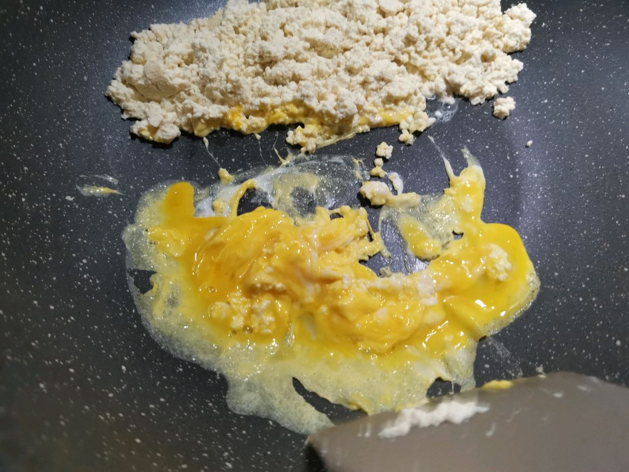 步骤4、开小火,把豆腐拨到一边,然后加鸡蛋炒碎