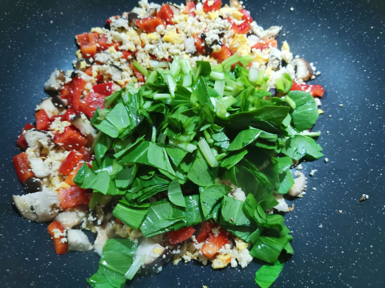 辅料:香菇5个大、鸡毛菜100g(一把)、彩椒1个、酱油1勺、盐5克