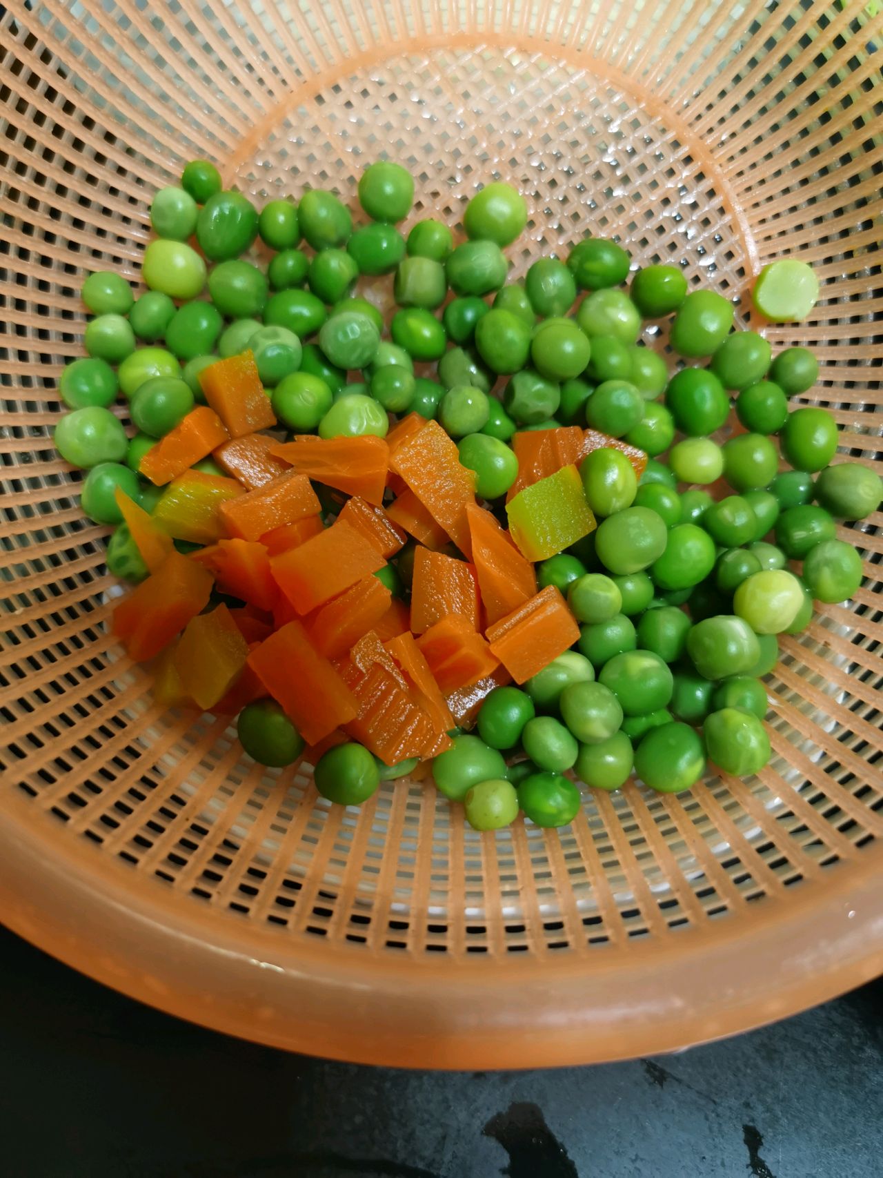 步骤3、胡萝卜切小丁,和青豌豆一起焯水3分钟后捞出沥干备用。