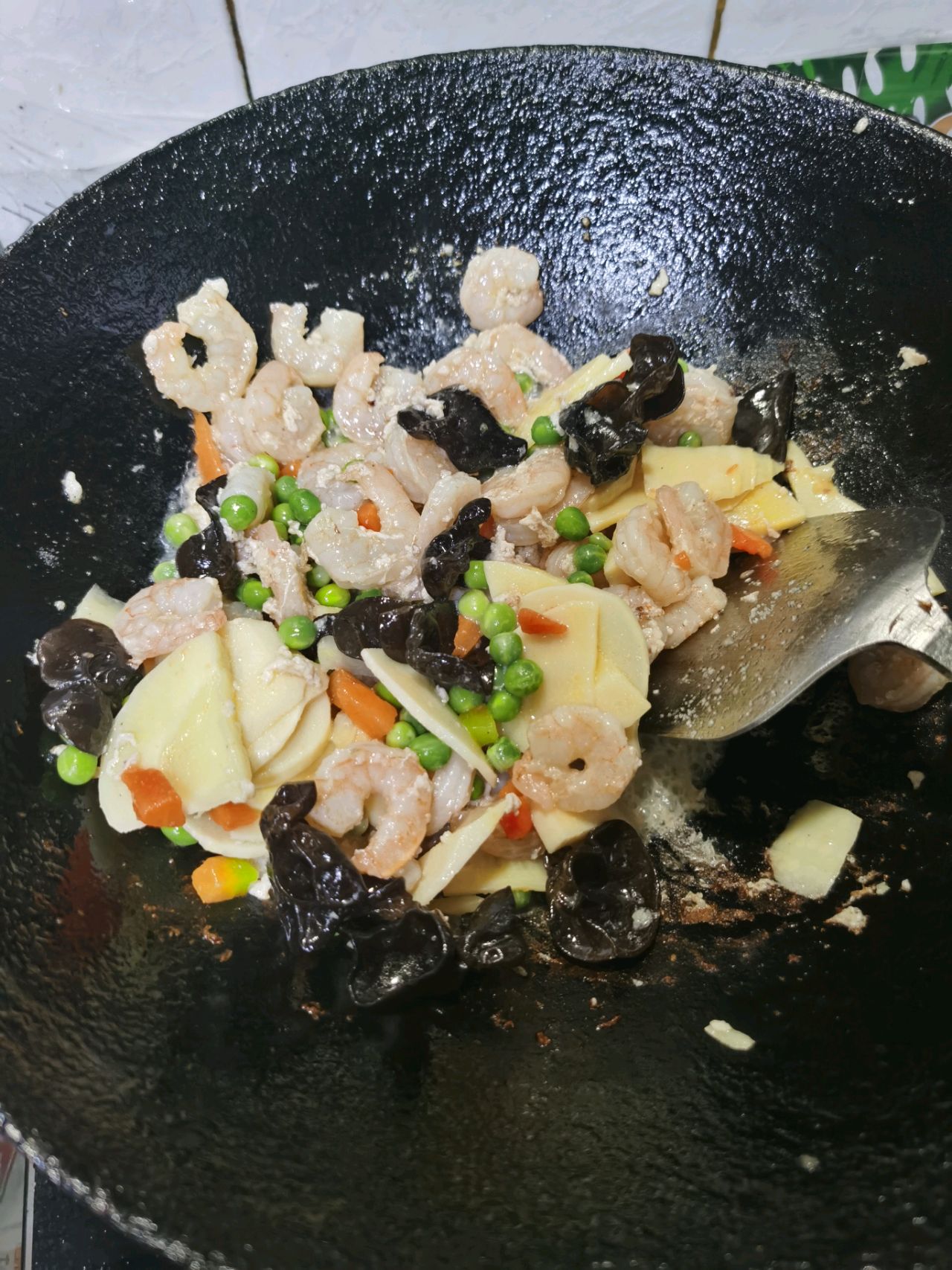 2.配料因为有冬笋尖和青豌豆胡萝卜丁等要比虾仁多加点盐才能把鲜味逼出来。老话说的好“鲜不鲜一把盐”没错的。