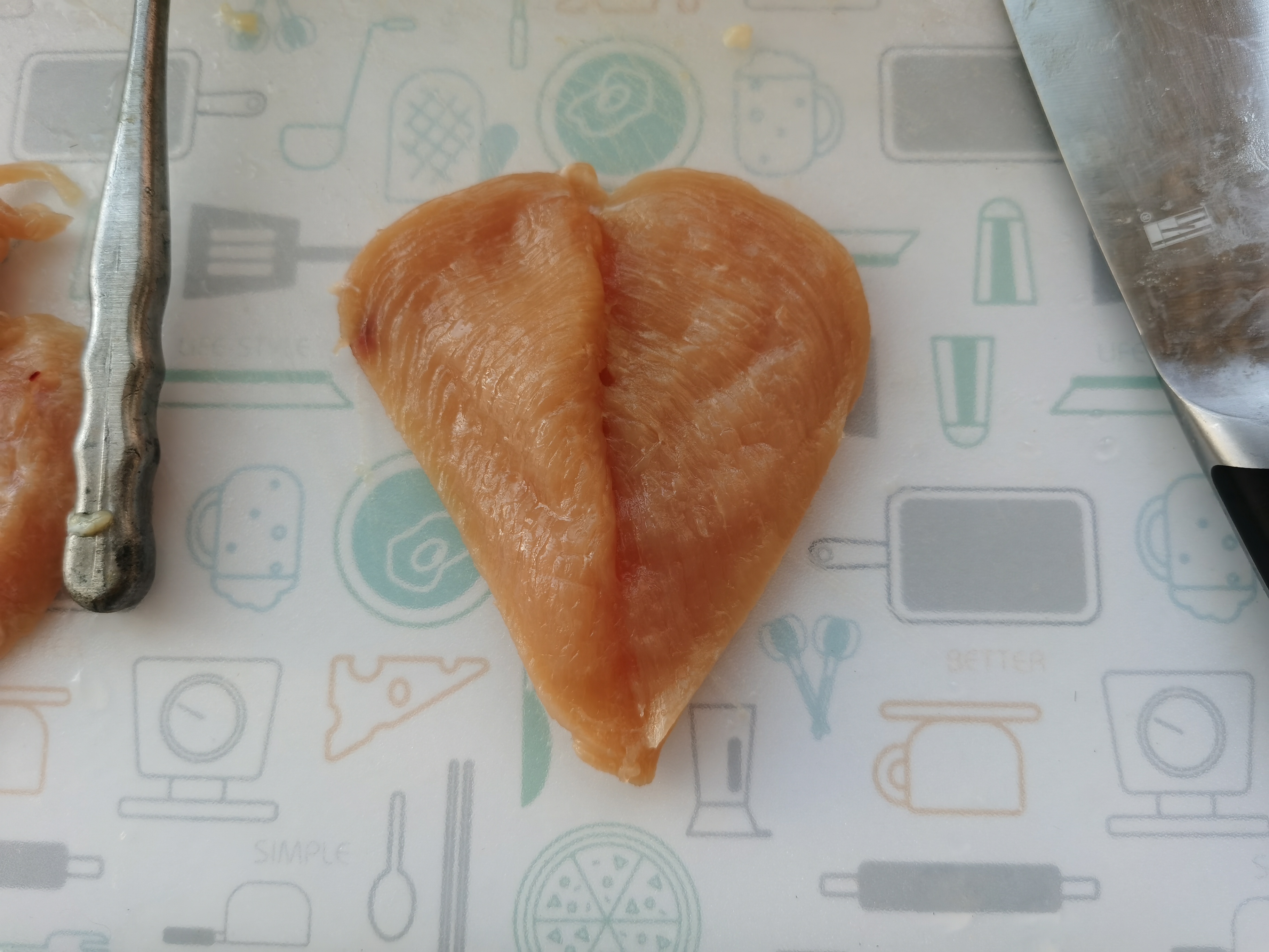 步骤1、1、先来说主角部分,我们说的那个大众的食材就是鸡胸肉,将鸡胸肉从中间抛开,注意不要切断,然后打开,将肉质砸松散,不要太用力