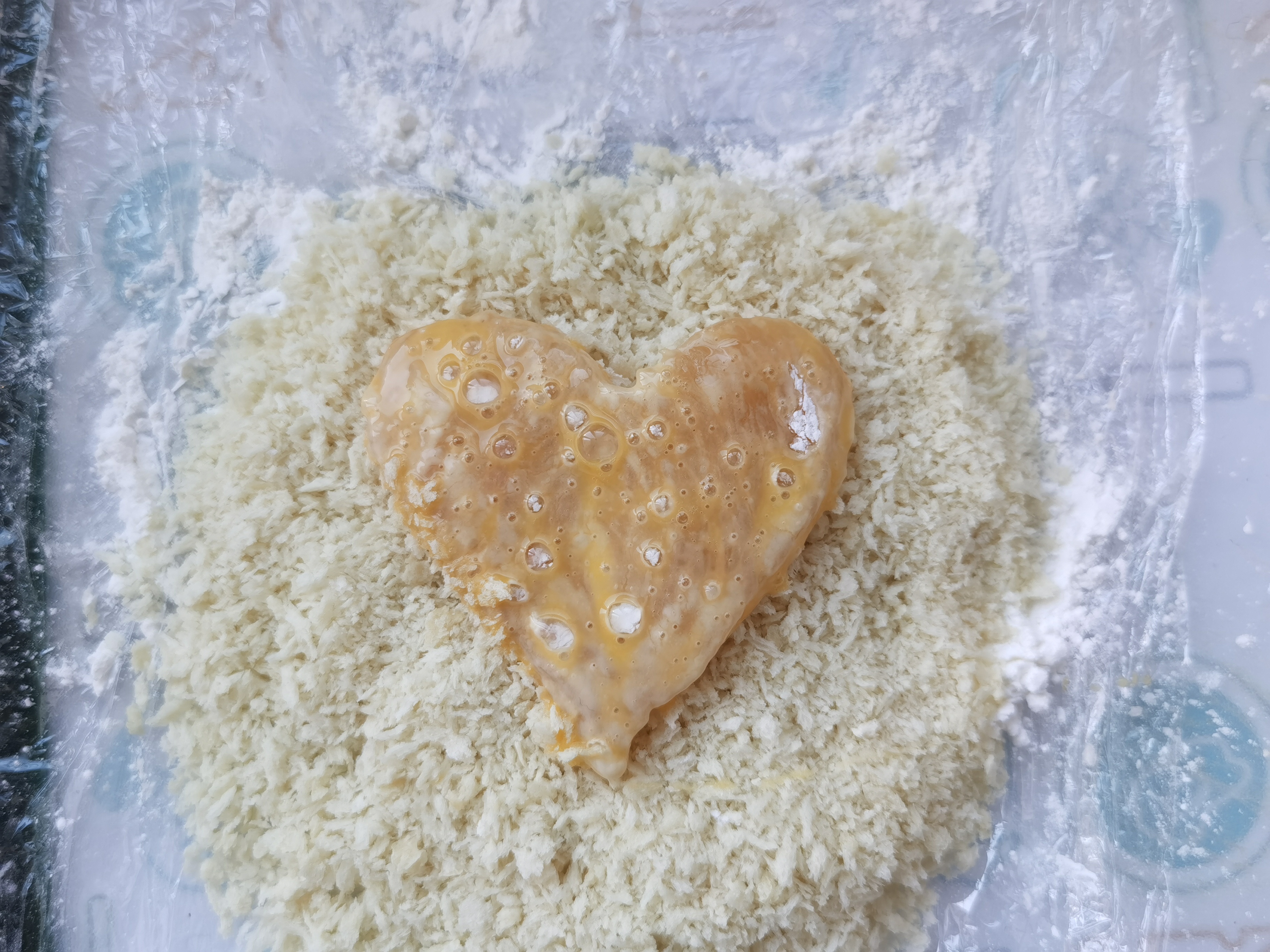 步骤4、4、裹上一层面包糠,蘸好后要按压一下