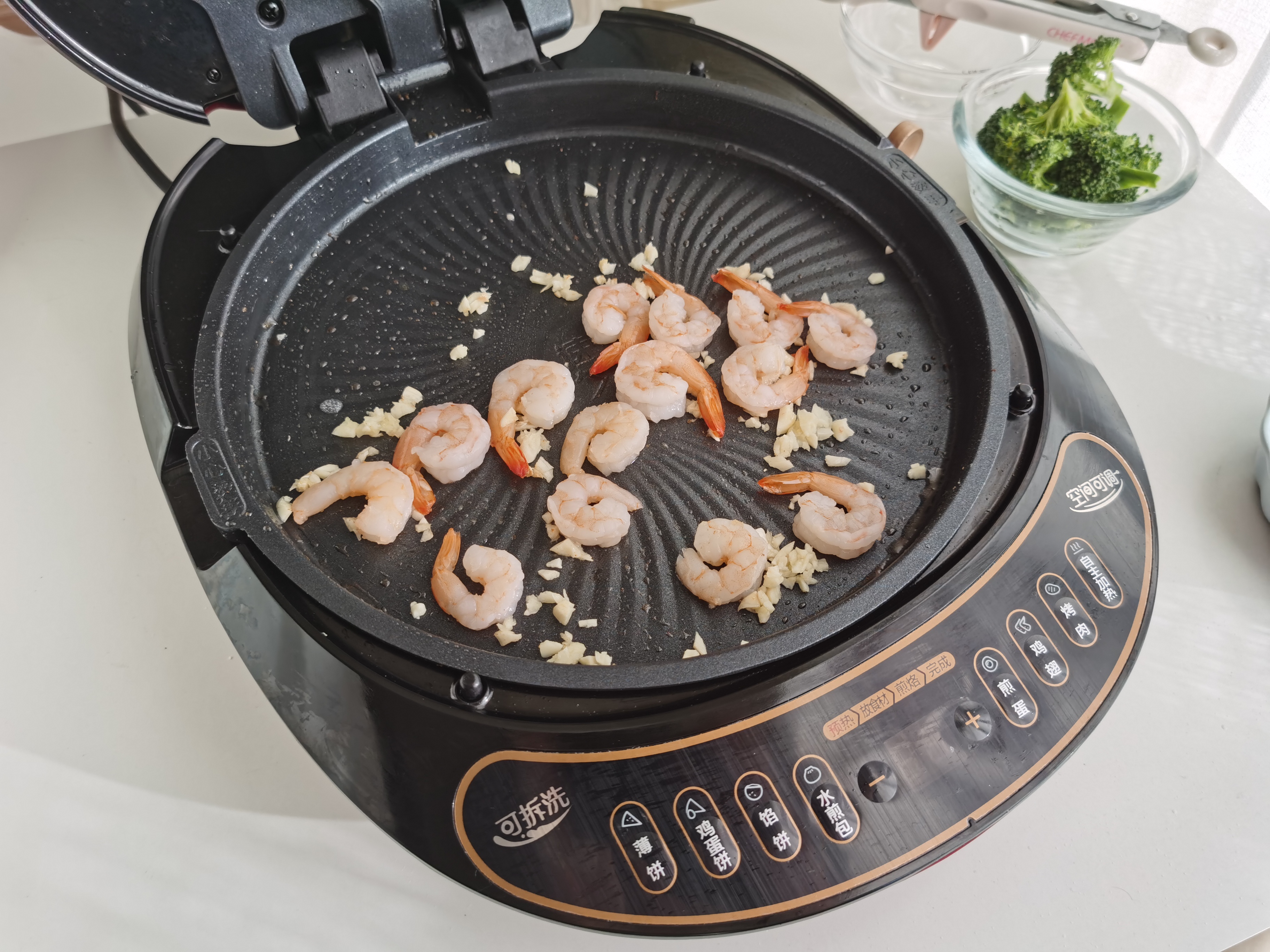 步骤9、9、整个便当唯一的青菜闪亮登场咯,我们将虾仁用玉米淀粉、白胡椒,适量的盐与玉米淀粉腌制后,煎烤机开启上下盘加热,放少量的油,将虾仁煎熟