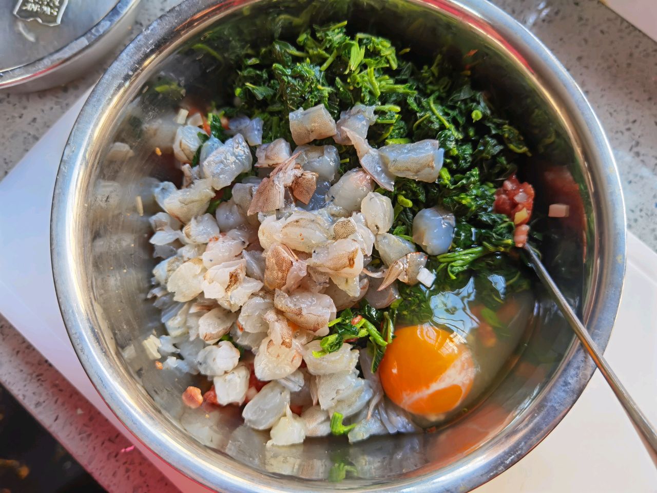 步骤3、放入苋菜和虾仁