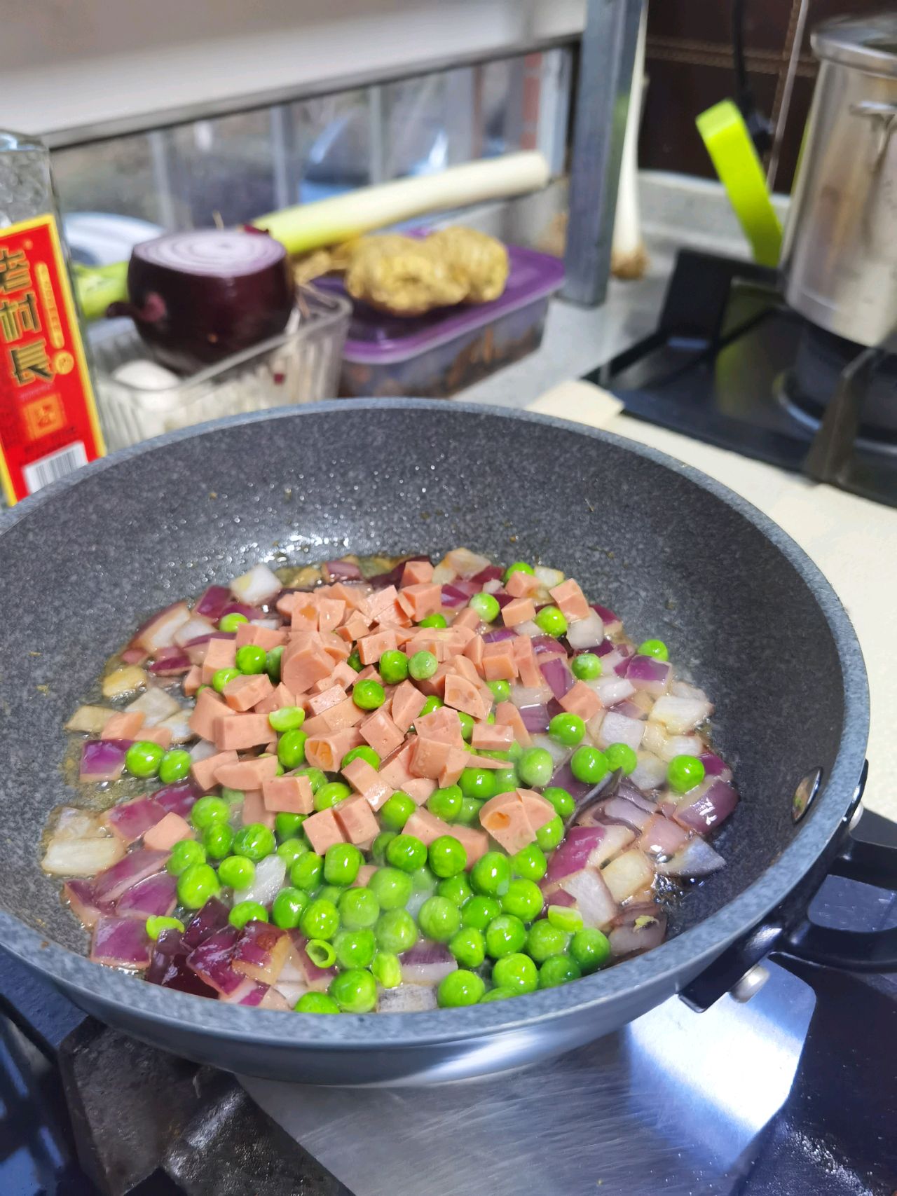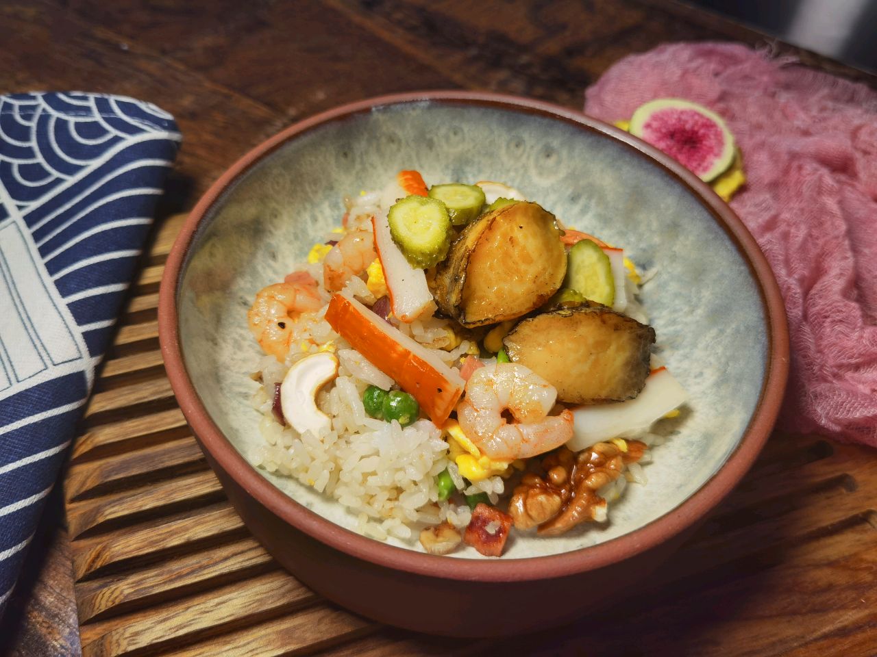 辅料:鲍鱼2个、洋葱1个、虾仁100克、米饭1碗