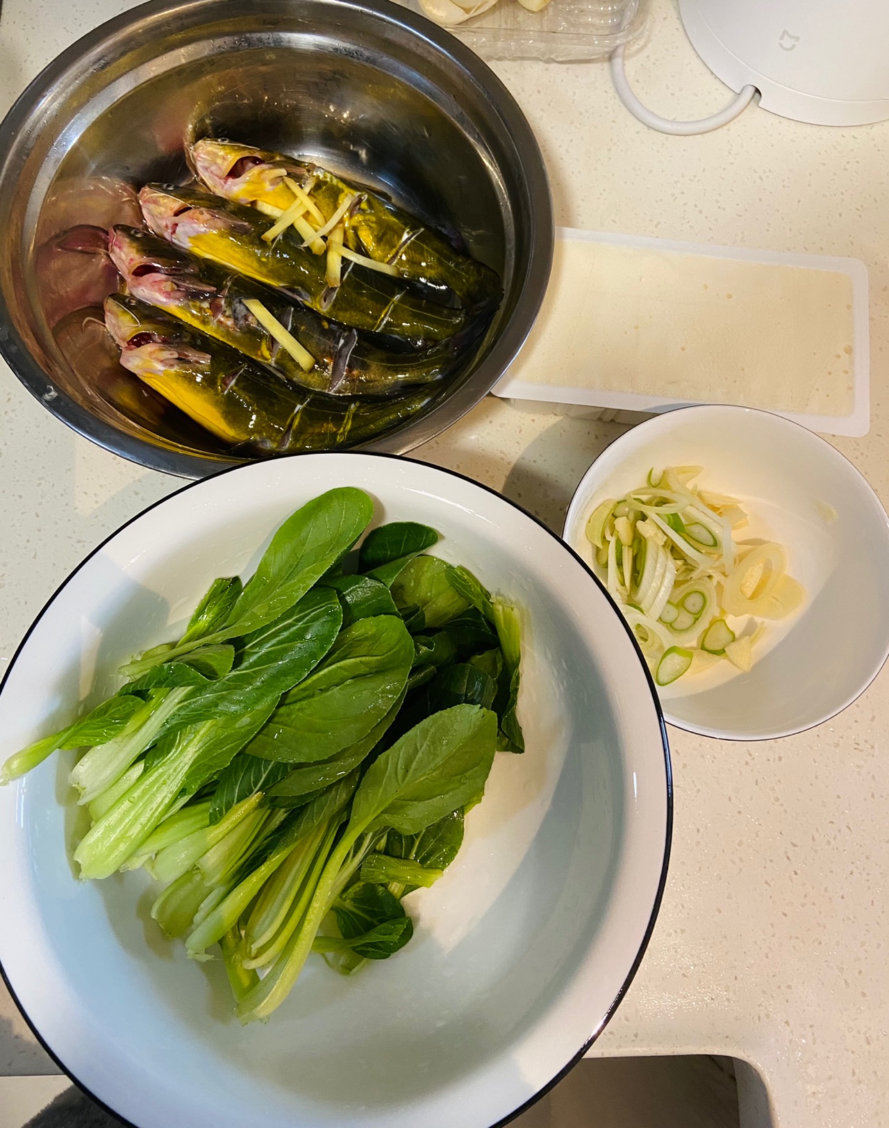 步骤2、昂刺鱼加料酒,姜丝腌制15分钟。大葱切斜刀,蒜切片。小青菜洗净,嫩豆腐划刀切块,备用。