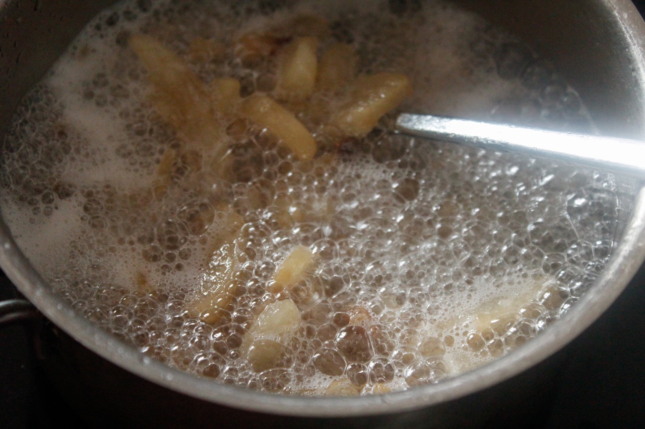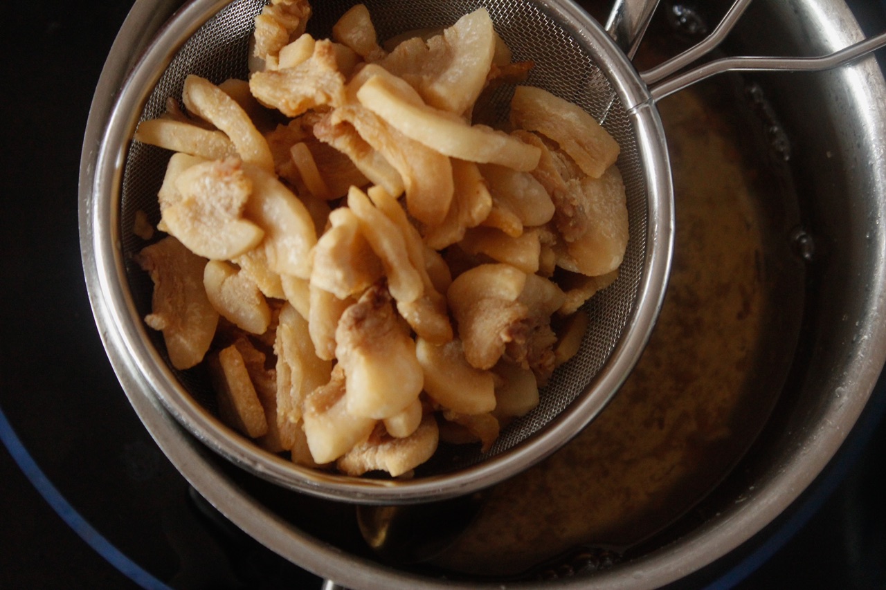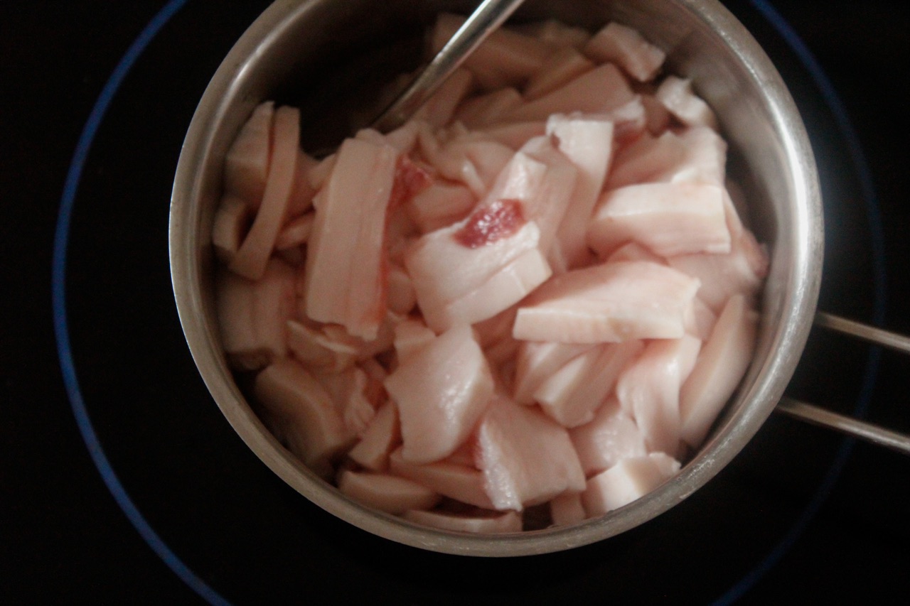 步骤6、30分钟左右,油渣变干变微黄、全部浮起,就关火。不能熬的太过,油渣熬的太过呈较焦黄色的话,猪油冷却凝固后也不会白哦。