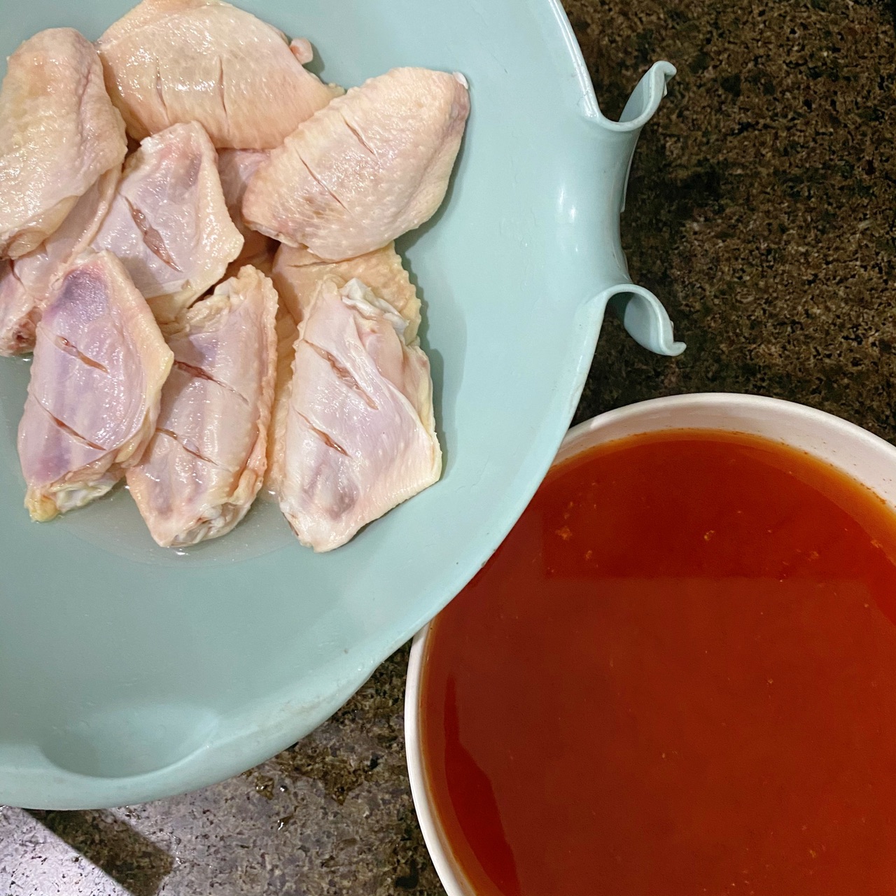 步骤1、买的奥尔良烤翅腌料,按比例配好