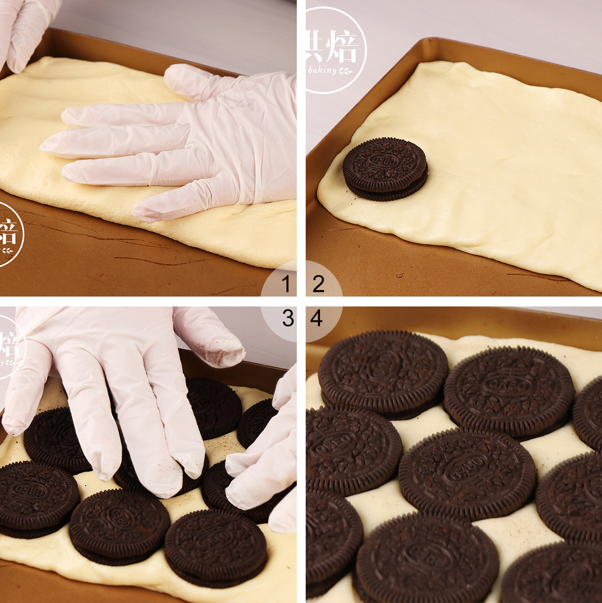 步骤4、等到棉花糖团不特别烫手了,双手带上手套,抹上植物油防粘。将棉花糖团铺开在不沾烤盘上。摊开成14厘米宽28厘米长的一片。在一半的面积里,放上9块完整的奥利奥,排列得紧密些。