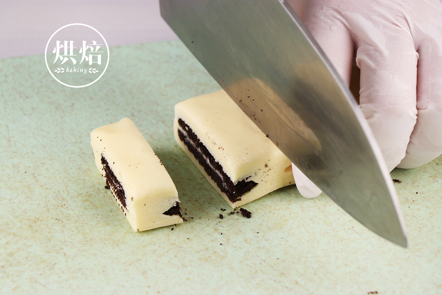 步骤5、然后盖上另一半糖,压紧,让棉花糖渗入到奥利奥之间的缝隙里,用刮板整理成正方形。然后连同烤盘一起放进冰箱里冷藏到棉花糖整体变硬。冻硬后取出来,沿着奥利奥的宽度切成三条