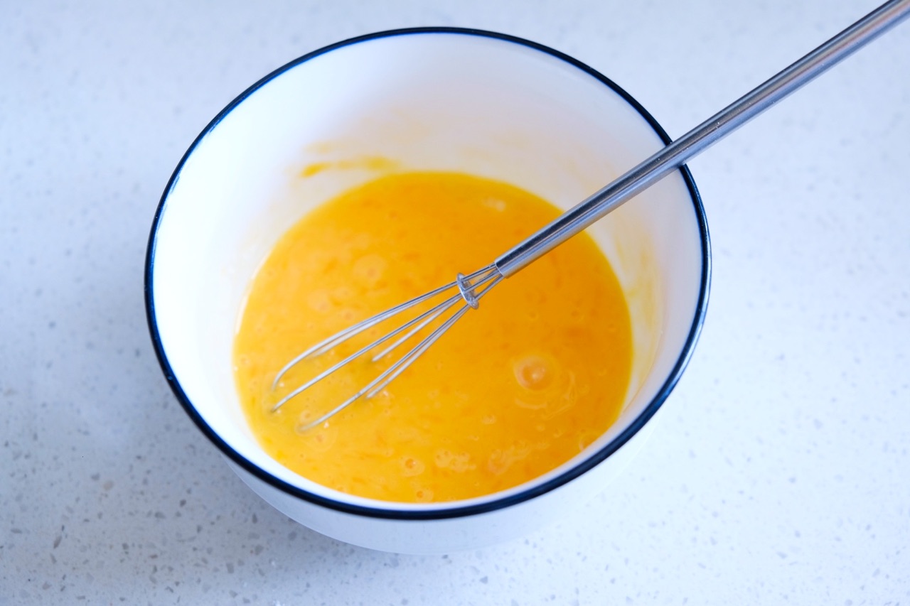 步骤4、混合好的面粉中加入鸡蛋液和牛奶拌均