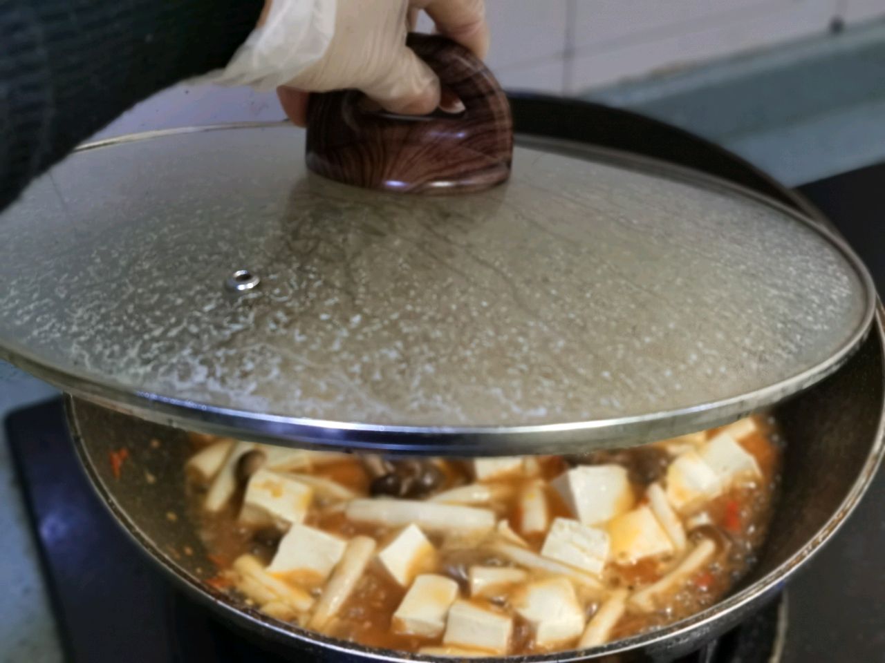 步骤4、倒入切成块的豆腐,盖起,焖~
