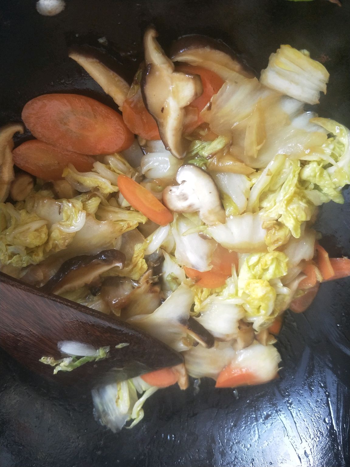 步骤3、最后放香菇,放入盐,白菜本身会出水,好熟的白菜不用格外加水了,如果白菜不好熟可少加一点水!