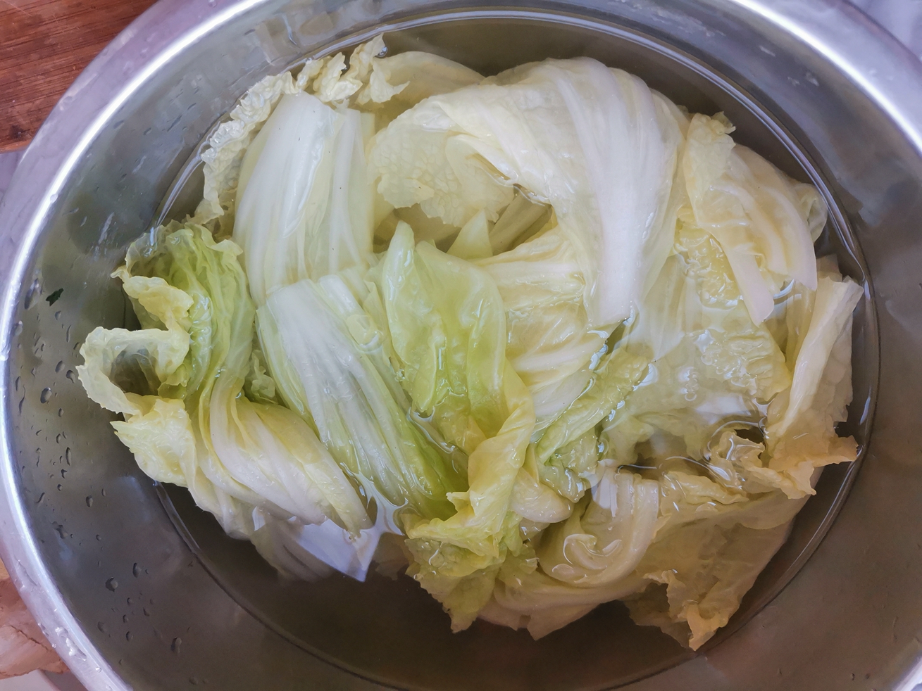步骤5、把白菜叶子放到开水中汆烫,捞到冷水里过凉备用。