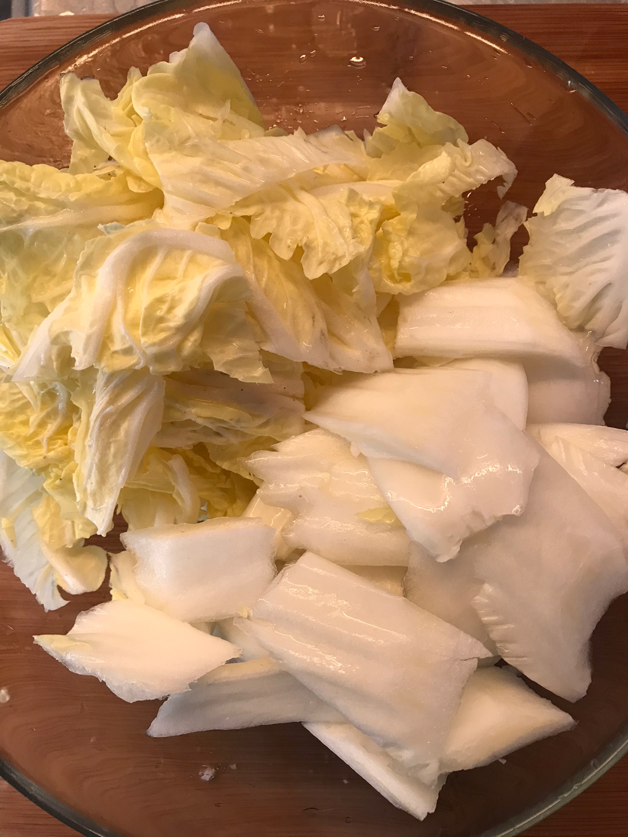 步骤8、切完小块的白菜,帮子和叶子分边儿放,一会儿下锅时帮子先下,叶子后下,帮子需要多炒几分钟