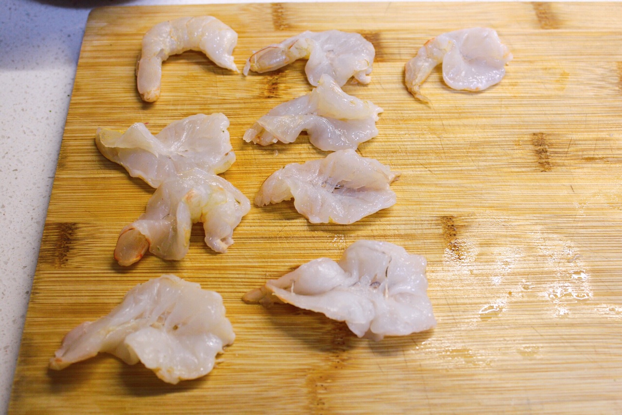 步骤2、制作敲虾:将虾仁从中间片开,去虾线后平展放置;