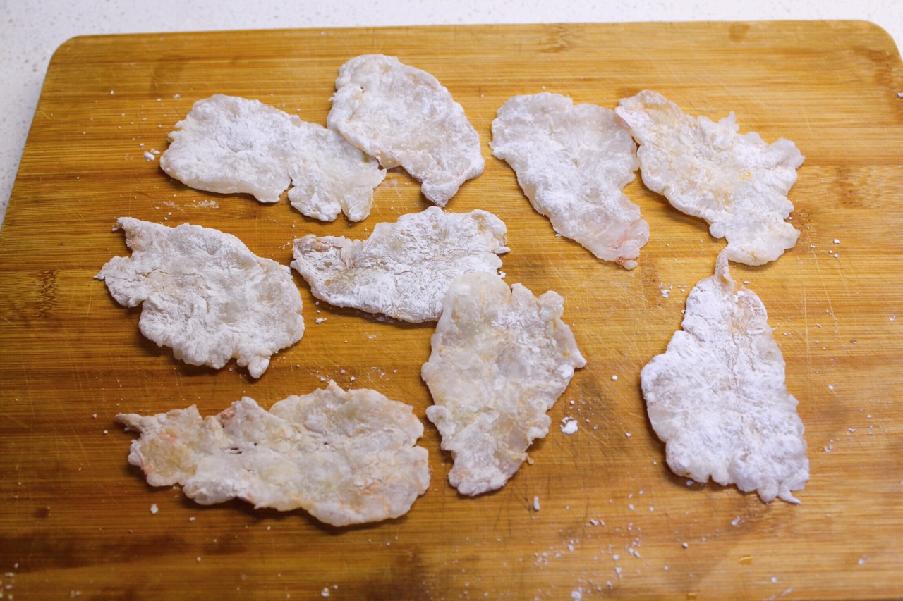 步骤3、放1勺淀粉在虾上,然后用擀面棍敲打虾肉使其平整变薄,淀粉少了露出虾肉再补一些淀粉继续敲打;