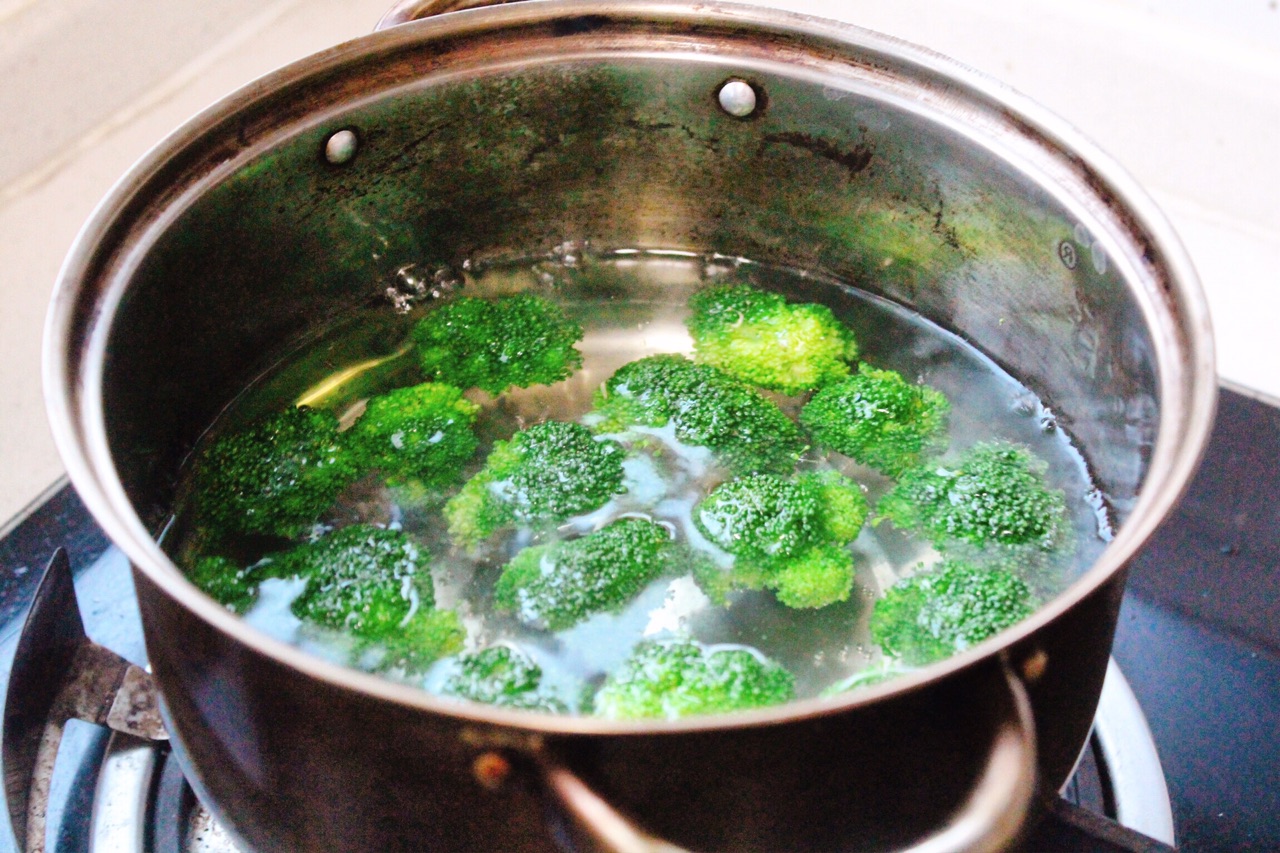 步骤5、锅中倒入水,加入几滴食用油,将西兰花过水焯烫至熟捞出;
