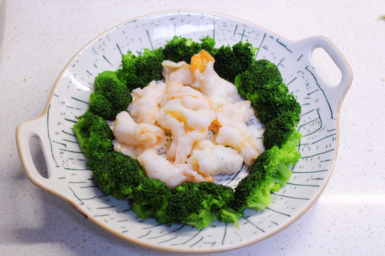 步骤7、将敲虾随意摆放在盘子中间,四周一圈摆放西兰花;