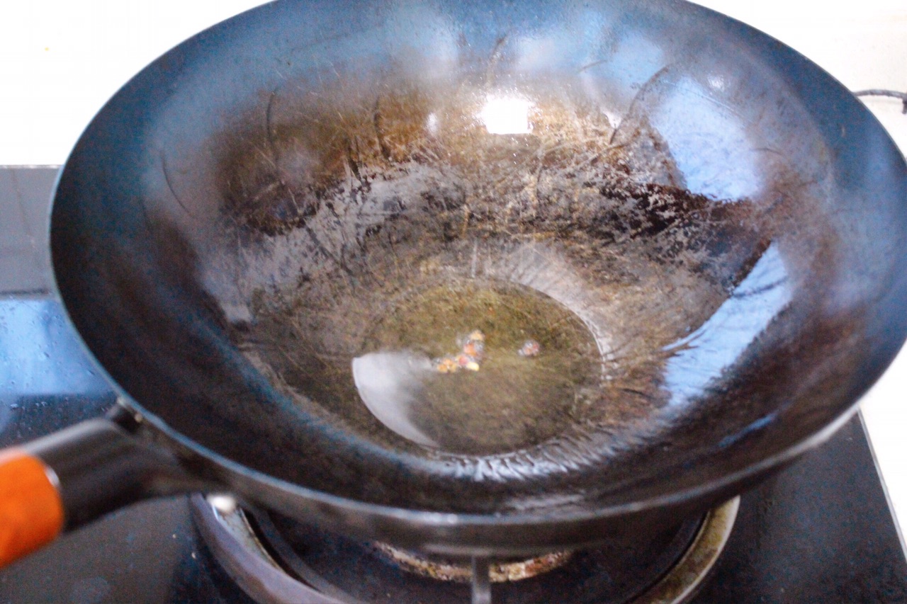 步骤9、制作白灼汁:炒锅中倒入食用油2勺,小火放入花椒煸香后捞出;
