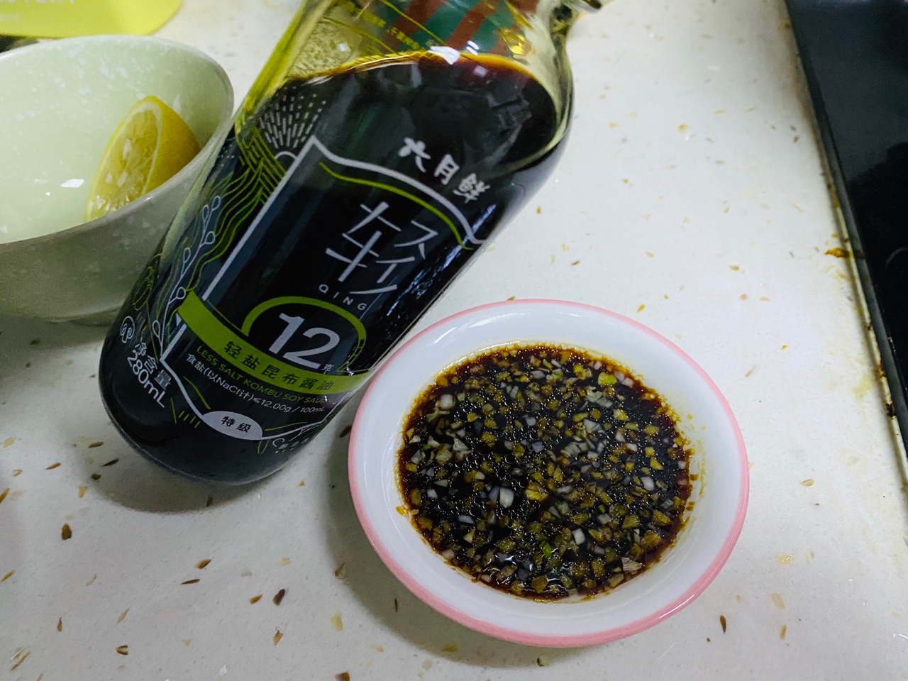辅料:蒜1瓣、六月鲜轻盐酱油2茶匙、柠檬汁1勺