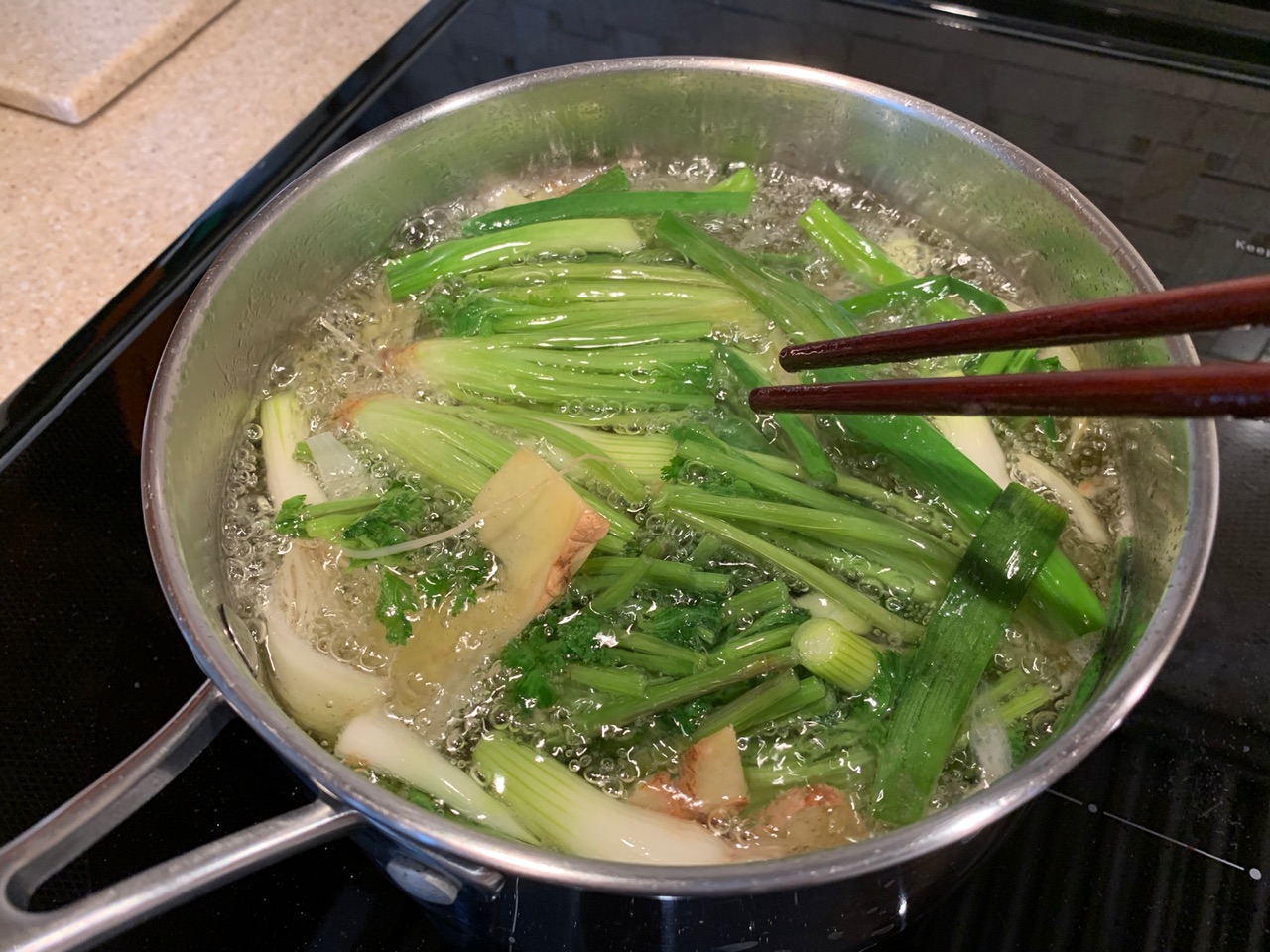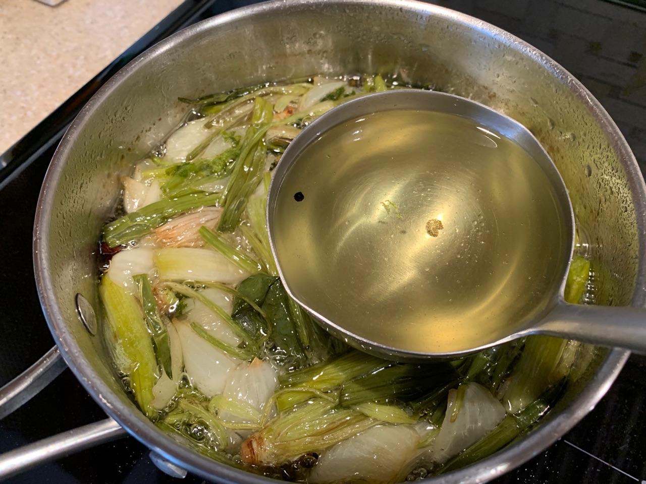 步骤3、小火投入洋葱,葱,姜,香菜根。